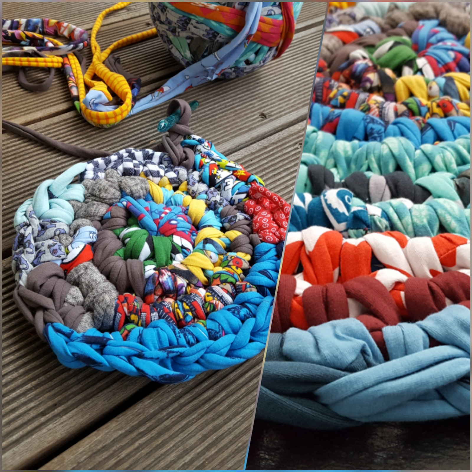 Immer wieder beeindruckend, wie schnell sich meine Stoffreste-Kiste füllt – und wieviel Platz dieselbige beansprucht. Zuwenig Stoff für Beanie oder Stirnband, grad noch genug für Puppenkleidchen und trotzdem zu schade um alles wegzuwerfen. Was tun? Gemäß dem Motto „nichts verschwenden, clever weiterverwenden“ kam mir die Idee, einen individuellen Badezimmerteppich zu häkeln. Bevors ich mich allerdings ans Häkeln machen konnte, musste ich viele, viele, sehr viele (!) Streifen schneiden und diese zu einer langen Schnur zusammennähen (hatte aufgewickelt die Größe eines Fussballs). Das war mit Abstand die langwierigste (und langweiligste) Arbeit. Das Häkeln ging danach wirklich flott. War eine lustige Abwechslung und schön, mal wieder etwas auf der Couch sitzend zu handarbeiten. Mit dem Ergebnis bin ich super happy und freue mich nun jeden Tag über meinen flauschigen, einzigartigen Teppich – jedes einzelne Stoffteilchen weckt schöne Näh-Erinnerungen.