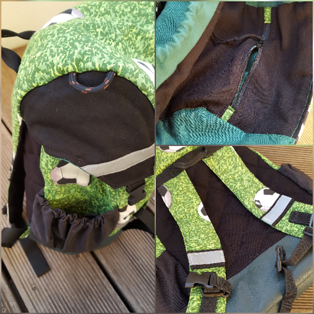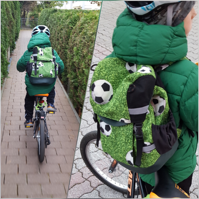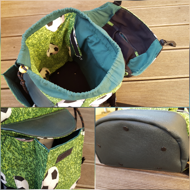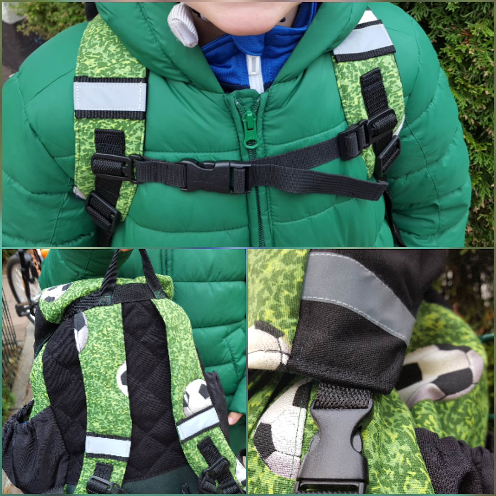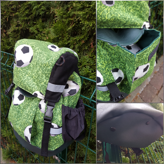 Der verstärkte Boden besteht aus dunkelgrünem Kunstleder, die seitlichen Taschen sind aus schwarzem wasserabweisendem Taschenstoff (perfekte für Trinkflasche), der Rest ist aus robustem Fußball-Canvas. Außen hab ich zur Sicherheit ein paar Reflektorbänder eingenäht. Die Reflektoren befinden sich auch an den Trägern. Sehr praktisch da es jetzt schon so früh dunkel wird.
