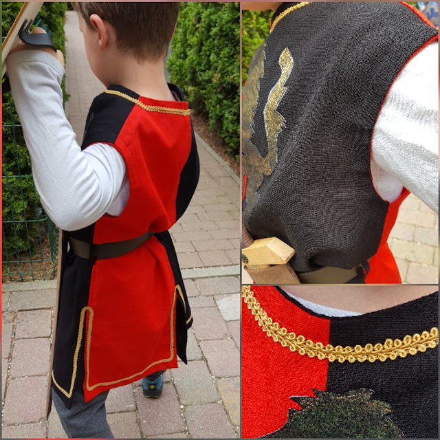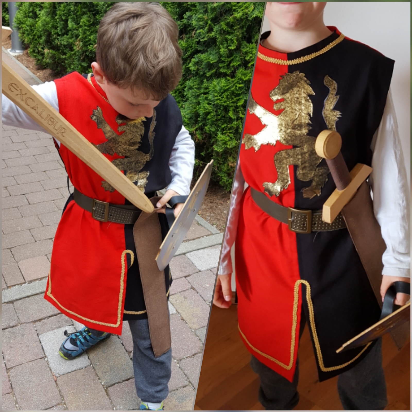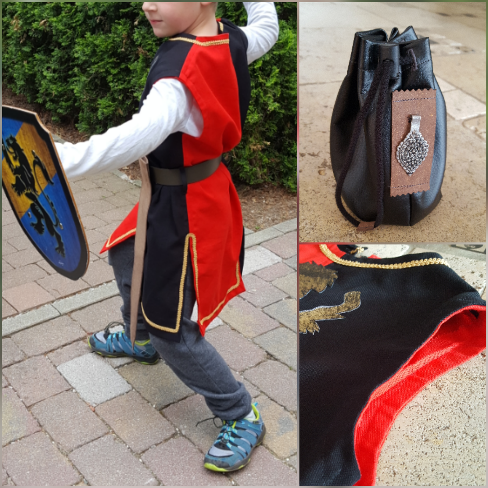 Warum auf den Fasching warten wenn es doch auch unterm Jahr genug Anlässe gibt sich zu verkleiden? Zum Beispiel als edler mutiger heldenhafter kühner Ritter! Vergangenes Wochenende fand auf der Festung Kufstein das alljährliche Ritterfest statt. Immer wieder ein Highlight für Groß und Klein. Da wir leider nicht dem Anlass entsprechend in passender mittelalterlichen Gewandung auf die Festung marschiert sind, musste/durfte ich meinem Jüngling als Entschädigung zumindest ein neues Schwert inkl. Schild schenken. Den passenden Waffenrock hab ich dann ein paar Tage später in den Wunschfarben rot und schwarz nachgeliefert. Der Schnitt ist selbst konstruiert, Armausschnitte und Kragen sind mit Belegen versäubert, am Rücken ist ein kleiner Schlitz inkl. Druckknopf um das Ankleiden zu erleichtern. Goldene Details (Zierband) und vorallem der große goldene Löwe (selbstgebastelte Applikation mit Vliesofix und Kunstleder) runden das Ritterkostüm ab. Um den Look perfekt zu machen trägt der Ritter von Welt einen nietenbesetzen Gürtel mit passender Schwertscheide (aus ReLeda genäht) und eine Gürteltasche (schwarzes Kunstleder mit ReLeda) für Goldtaler oder Kaugummi. Mein kleiner großer Held ist glücklich und stolz – und ich bin es auch 🙂
