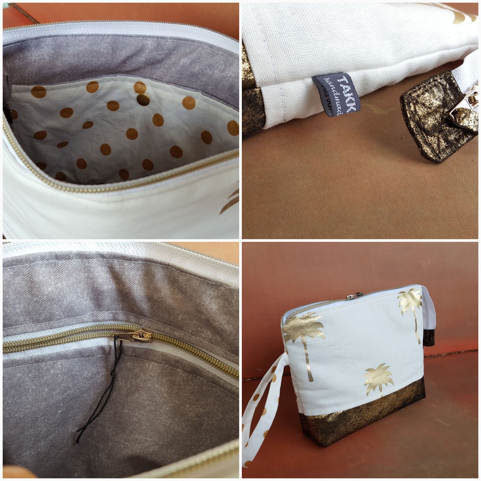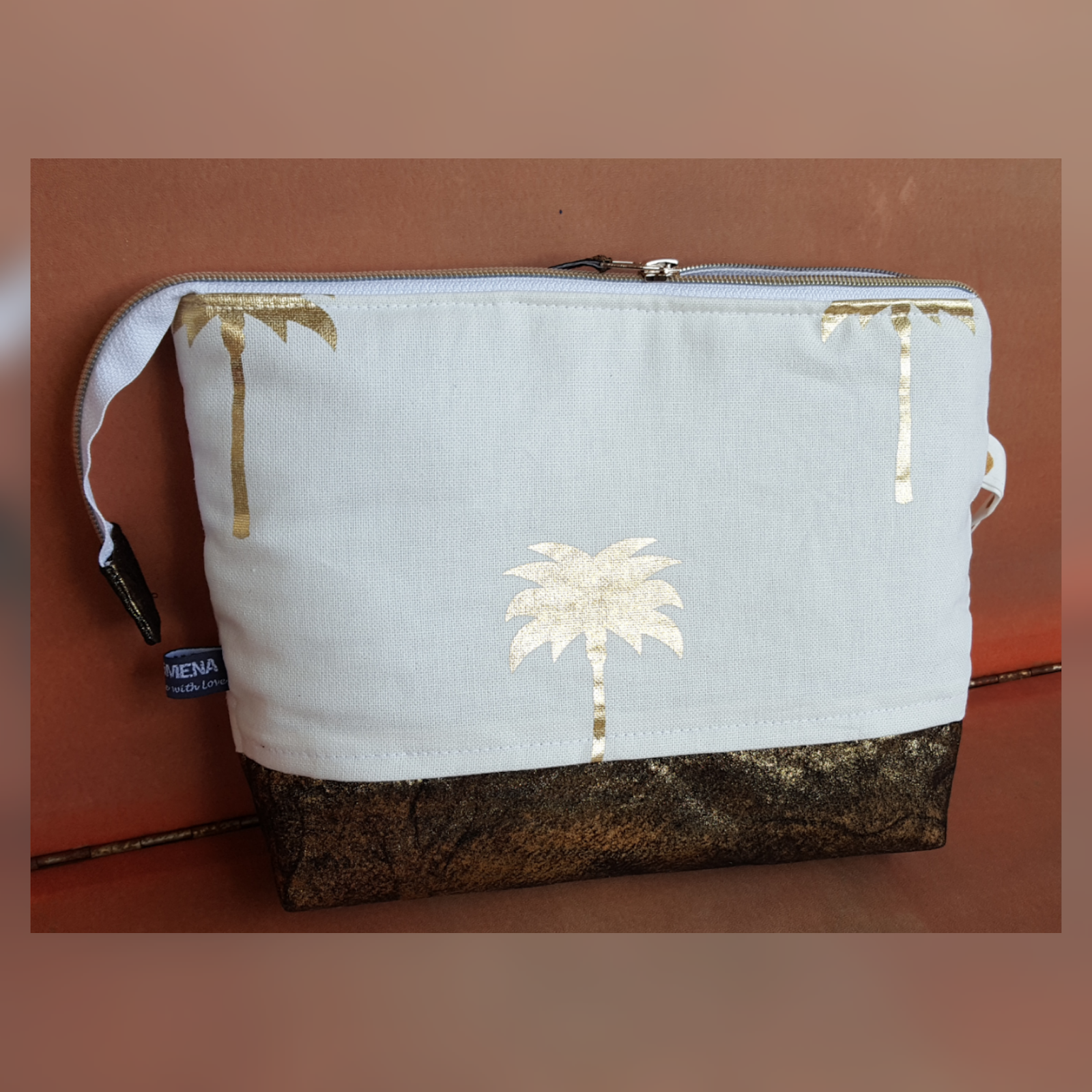 Zu spät für den Geburtstag aber immerhin noch rechtzeitig zum Urlaub ist dieses sommerlich-frische Kosmetiktascherl für eine liebe Freundin fertig geworden. Mit 30 x 20 x 8 cm hat es die ideale Größe für Sonnencreme und andere Strandbegleiter. Innen Steck- und Zipperfach. Das Kunstleder und der metallic Palmenstoff sind von lieblingsstuecke.at, Futterstoff und metallisierter Zipper von Snaply.