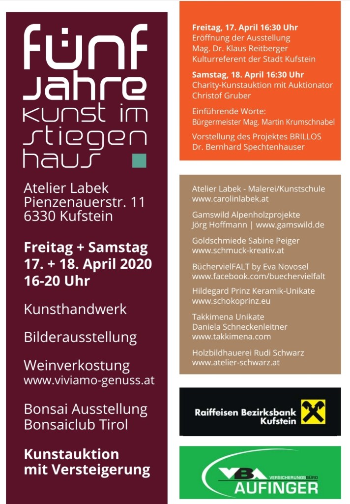 Was erwartet Euch? Eine feine Auswahl an Kunsthandwerk, eine Bilderausstellung, eine Weinverkostung, eine Bonsai-Ausstellung vom Bonsaiclub Tirol sowie eine Kunstauktion inklusive Versteigerung. Am Freitag eröffnet Mag. Dr. Klaus Reitberger, Kulturreferent der Stadt Kufstein, um 16:30 Uhr die Ausstellung. Am Samstag findet um 16:30 Uhr eine große Charity-Kunstauktion mit Christof Gruber als Auktionator zugunsten der Hilfsorganisation BRILLOS statt. Einführende Worte hören wir von Bürgermeister Mag. Martin Krumschnabel, Dr. Bernhard Spechtenhauser stellt das Projekt BRILLOS näher vor.