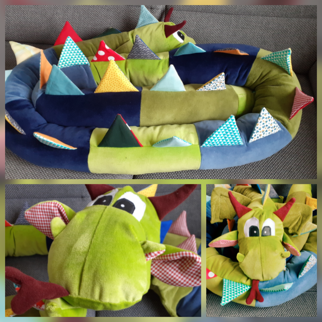Aus Elliot dem Schmunzelmonster wurde Elliot das Kuschelmonster. Der bunte drei Meter lange Drache ist aus Nikistoff genäht, hat vier Kissenfüllungen im Bauch, ein freundliches Wesen, knisternde Stacheln und Ohren und immer ein wachsames Auge. Ich hoffe mein bunter Freund wird seinem neuen Besitzer (noch schlummert er in Mamas Bauch) viel Freude und vorallem stets süße Träume bescheren.