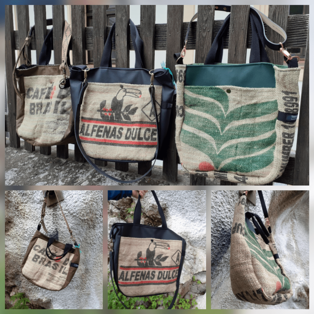 Habe mich seit längerem wieder dem Upcycling von Kaffeesäcken gewidmet. Wenn man direkt nach dem Zuschnitt alles schön versäubert hält sich das Feinstaub-Gefussel auch in Grenzen. Den doch sehr groben Jutestoff habe ich mit Baumwollstoff und Vlies verstärkt damit alles blickdicht und stabiler ist. Entstanden sind drei richtig coole und einzigartige Shopper in Kombi mit Kunstleder und Oilskin. Den Schnitt hab ich mir kürzlich entsprechen der eigenen Tragevorlieben selbst gebastelt. Wie gefällt er euch? Ich würde am liebsten alle drei selbst behalten. Meine Kaffeesack-Kreationen sowie andere neue Taschen und Accessoires warten auf euch – also kommt vorbei, wir freuen uns auf euch 😘🎉