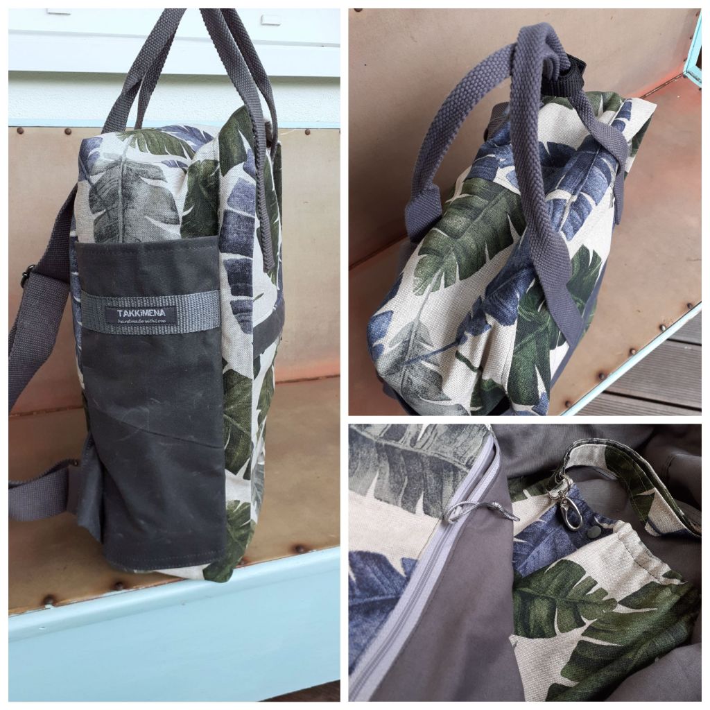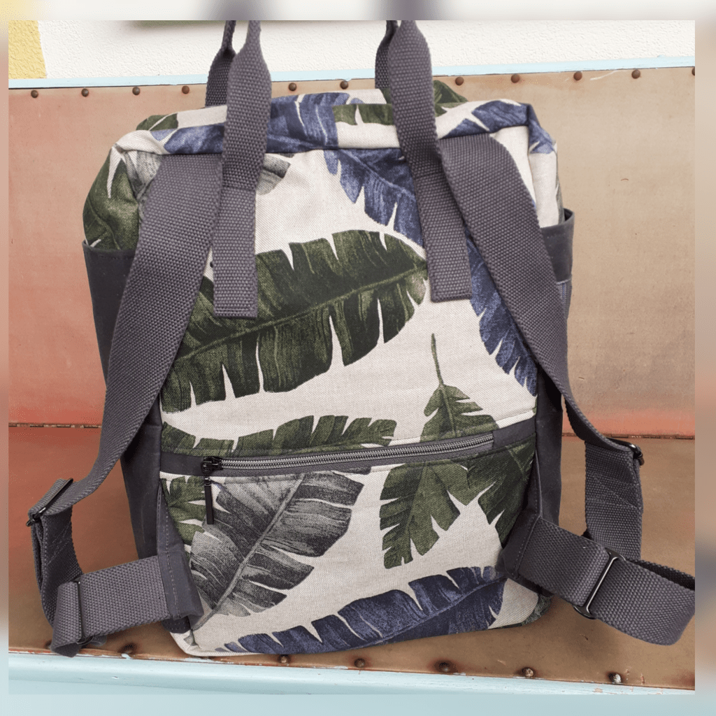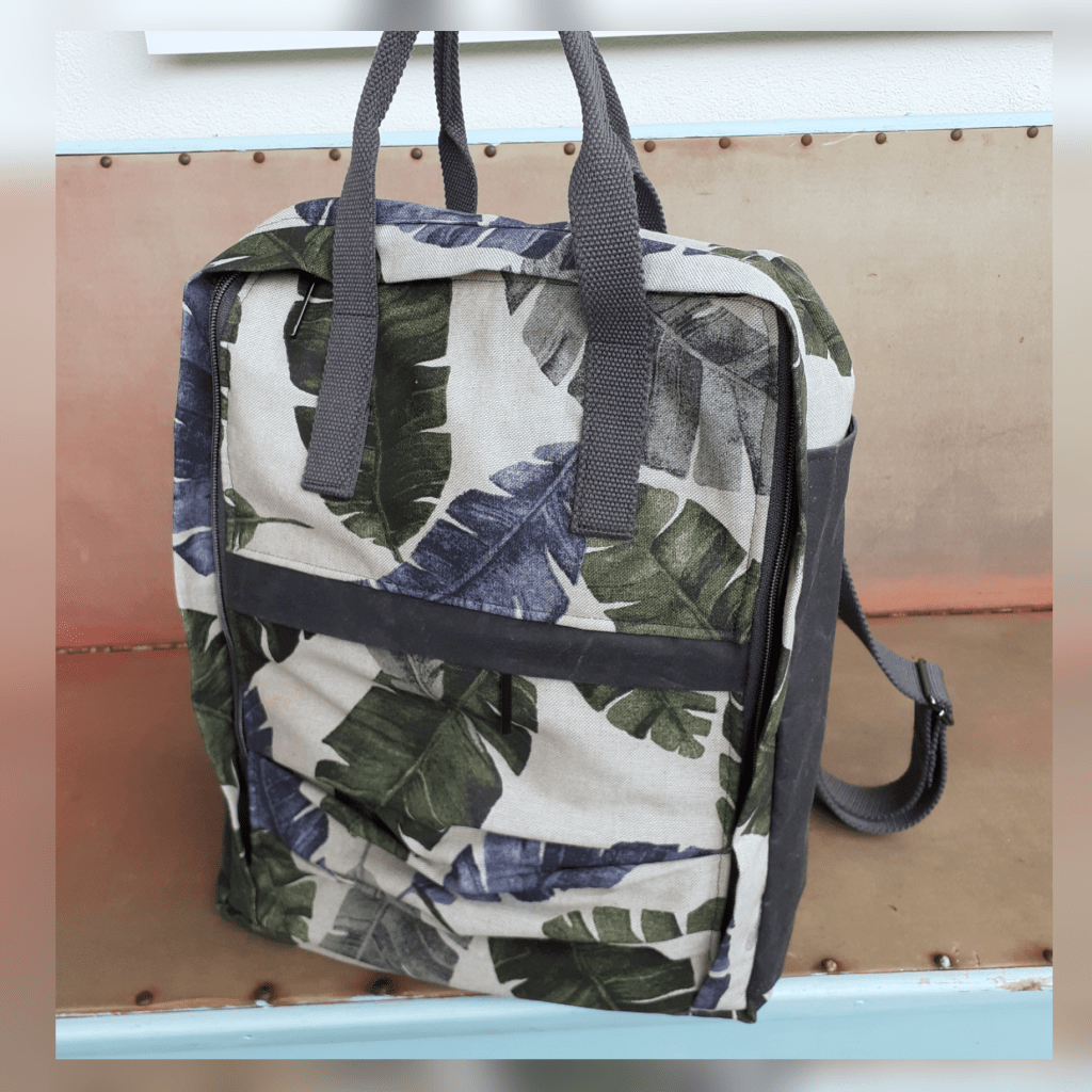 Bitte näh mir auch so einen Rucksack, genau denselben!… Wenn ich so etwas gesagt bekomme, geht mein Herz auf – größtes Kompliment überhaupt! 100% gleich war nicht machbar, das ist ja das Schöne an Unikaten. Aber fast. Bis auf den Blätter-Canvas hab ich alles genauso genäht wie bei meinem Sardinien-Rucksack (siehe Blogbeitrag hier), der hier Pate stand. Wieder wurden Canvas und Oilskin kombiniert und zwischen die Stofflagen eine Schicht Regenjackenstoff mitgenäht – hält sicher keinem Gewitter stand, aber ein paar Tröpfchen kann er abwehren. Die Innenausstattung, die in Falten gelegte Fronttasche, das unverzichtbare weil so praktische Zipperfach am Rücken und alle anderen Details sind genau gleich. Ich finde die beiden Rucksäcke passen wunderbar zusammen, zwei Unikate genauso wie ihre neuen Besitzer! 💚 perfect match 💚