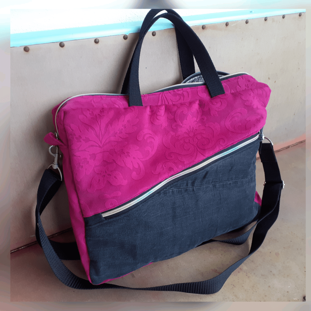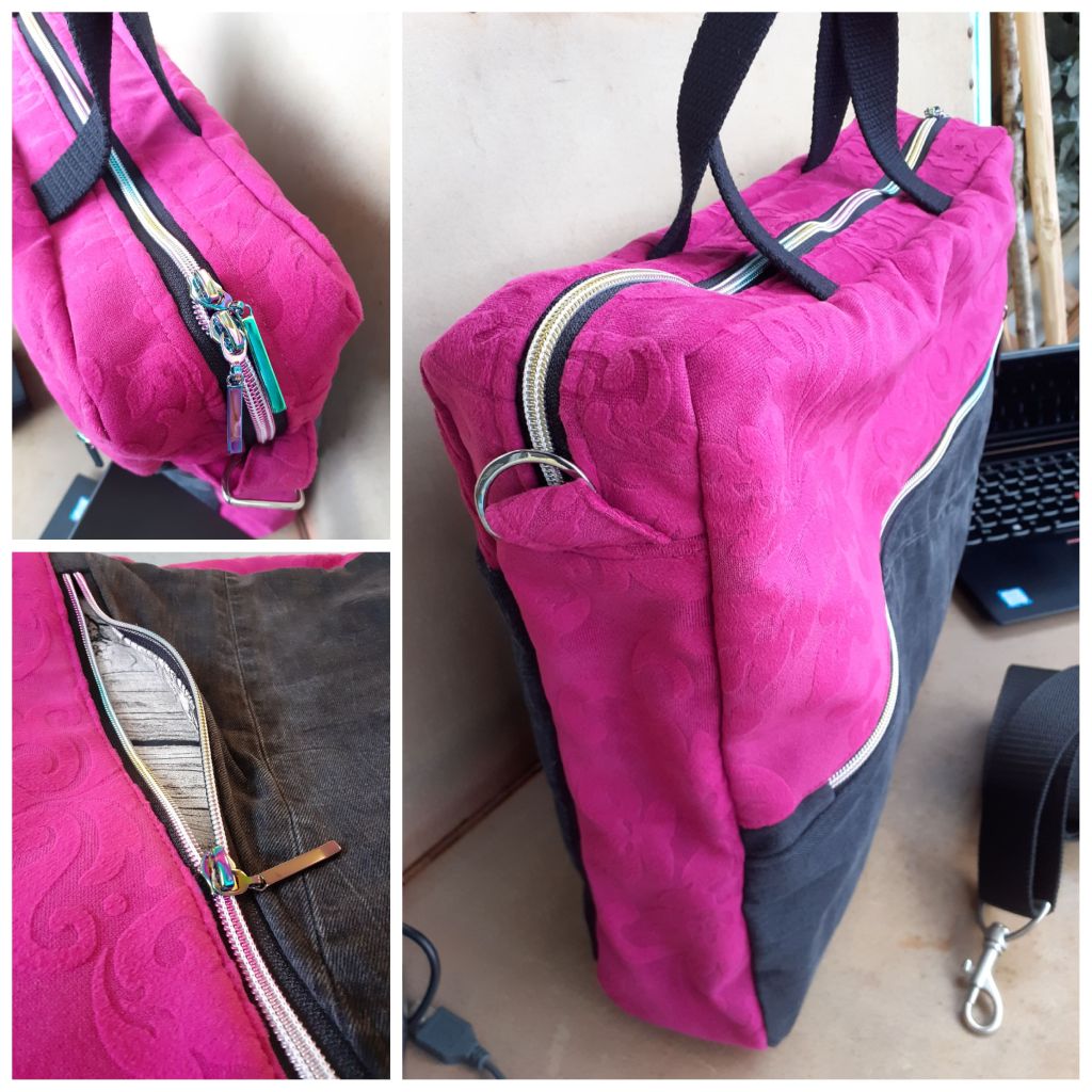 Das Leben ist kein Wunschkonzert! … Ach ja? Also wenn es um Taschen geht schon 😉 Bei meinem jüngsten Auftrag hab ich alle möglichen und vorallem die gewünschten Saiten aufgezogen. Entstanden ist eine richtig große Bürotasche (42 x 34 x 8 cm) mit ausreichend Platz für Laptop, Mouse, Mousepad, Ladekabel, Schreibutensilien uvm. Für den Außenstoff habe ich eine Jeans zerlegt und die Reste eines robusten samtigen Möbelstoffes verwendet. Der Schnitt ist eine an die Laptopmaße adaptierte Variante von Hansedellis Kuoria. Die Auftraggeberin hat sich alles selbst ausgesucht – die Stoffe, den Schnitt, das Gurtband, die Rainbow-Zipper, die Ausführung der Außentaschen. Alles. Mobile Working steht nun nichts mehr im Wege – in ihr neues Unikat passt das halbe Büro hinein 😉