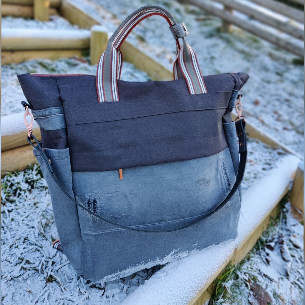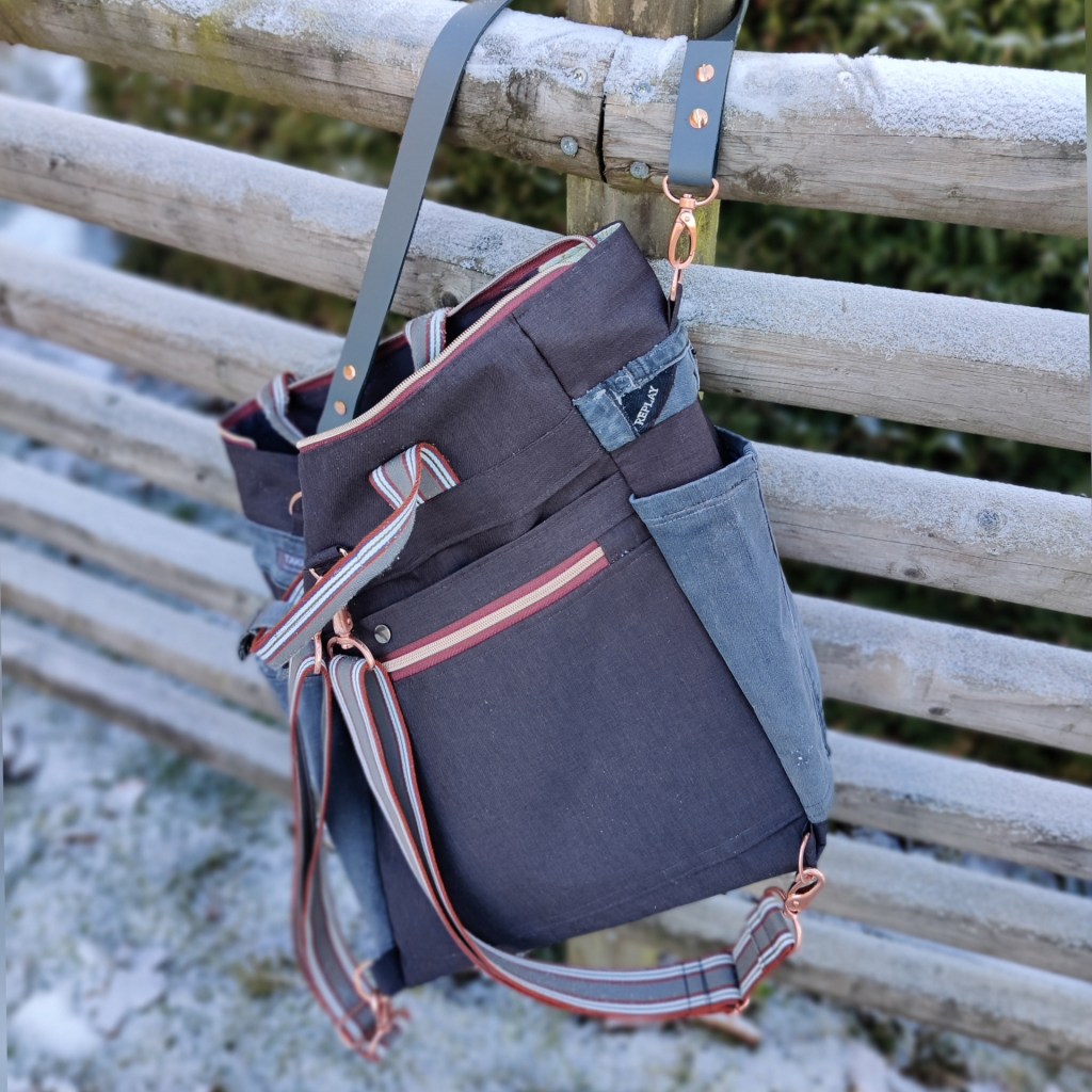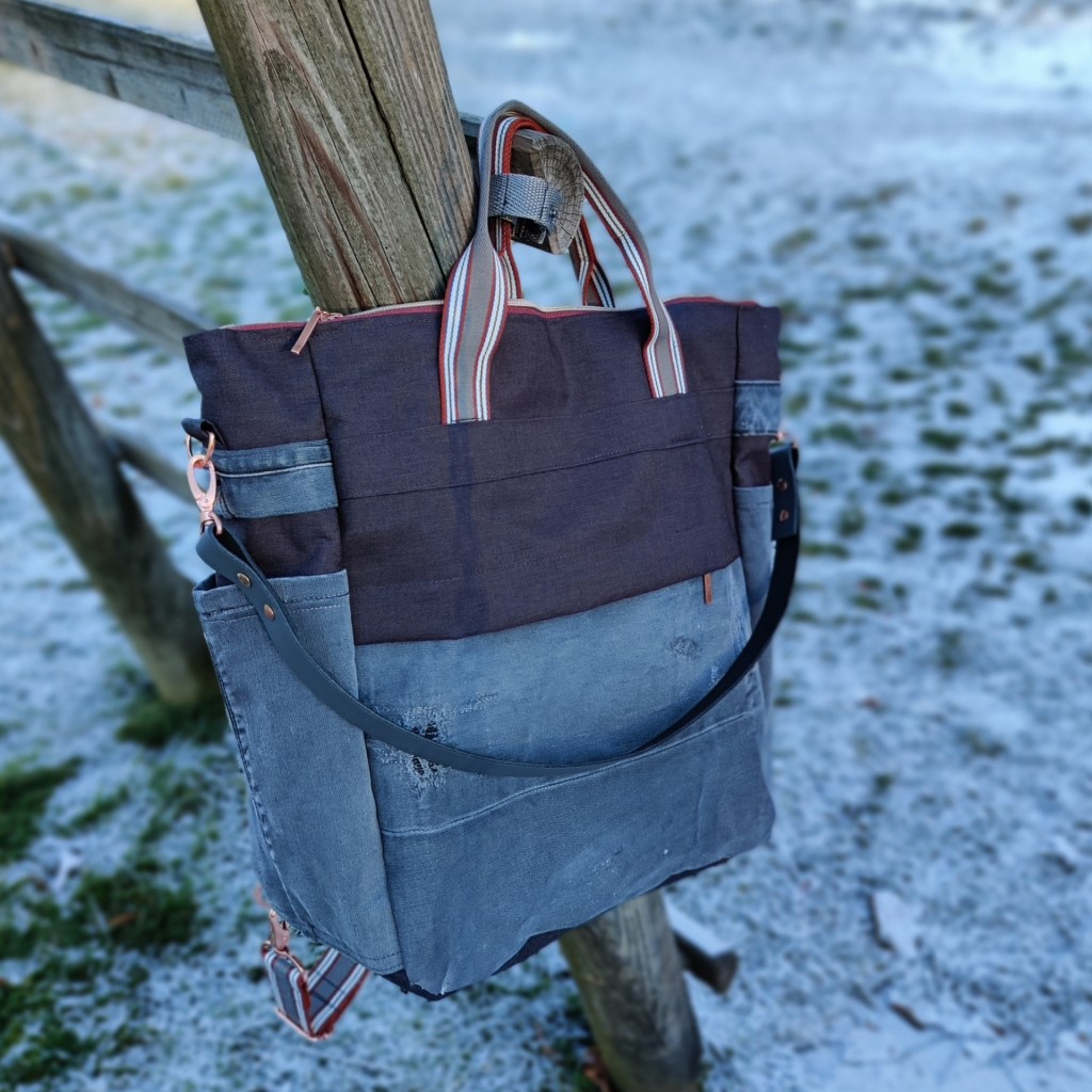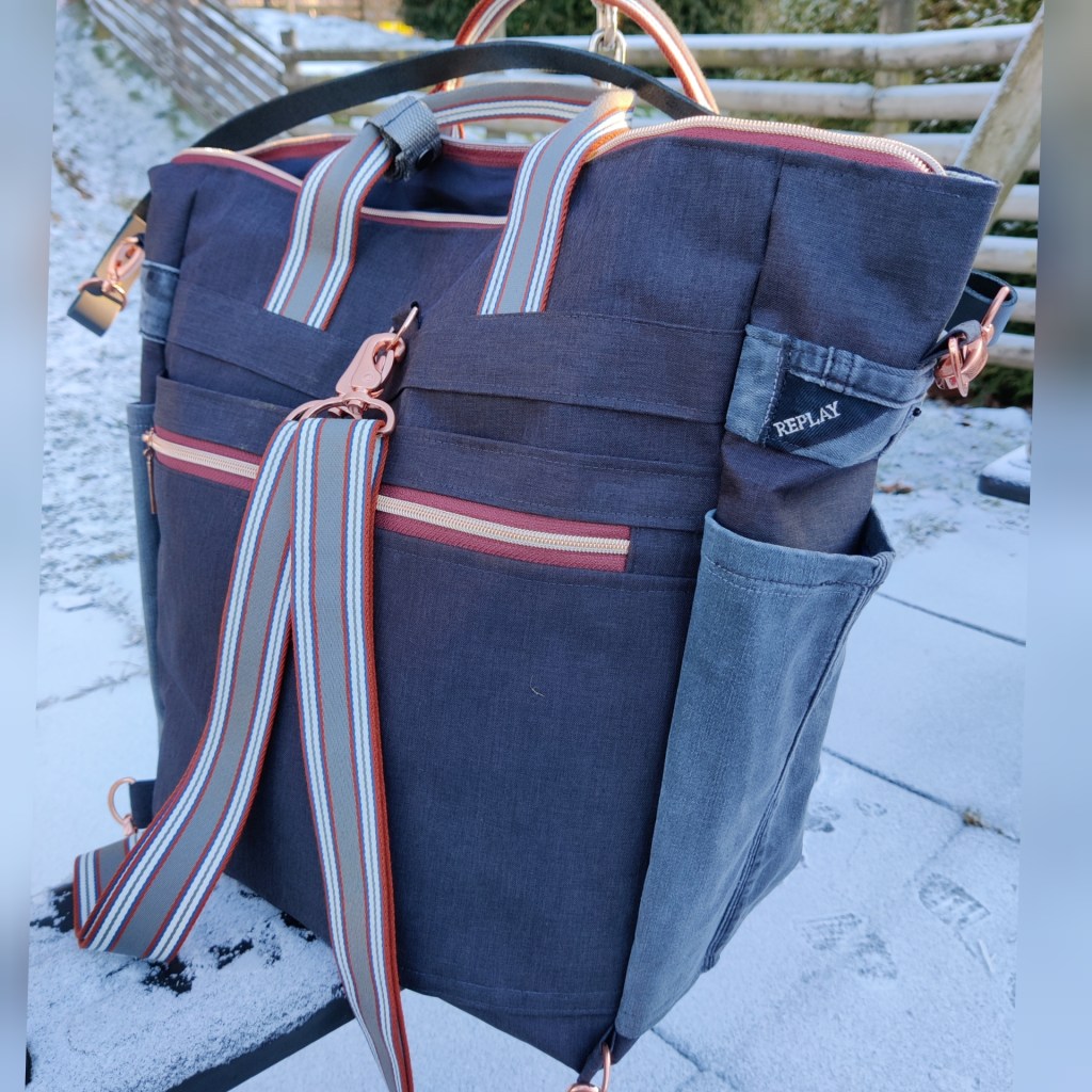 Meine kürzlich vorgestellte Freestyle Tasche (Arbeitstitel ‚Wonder Bag‘) gefällt offenbar nicht nur mir 🥳 Eine Kundin hat sich jetzt auch so eine Wundertasche gewünscht: eine Spur größer (43 x 15 x 50 cm) und in Kombination mit einer gebliebten, ausrangierten Replay Jeans. Das Gurtband ist ein alter und gern vernähter Bekannter – genial zu verarbeiten und farblich eine perfekte Harmonie mit dem Zipper. Die Tasche ist dank Outdoorstoff auch wasserabweisend. Innen und außen hat sie viele praktische Fächer, auch ein eigenes Laptopfach ist dabei.