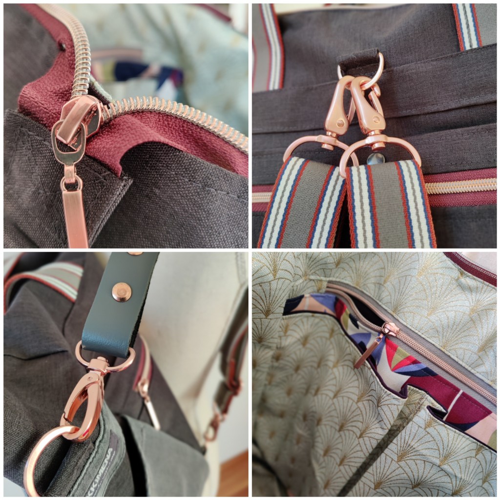 Outdoorstoff Isah schwarz, gemusterte Canvas (Futter), Taschenzubehör in Kupfer und metallisierte Zipper sind von Snaply Nahkram. Das gestreiftes 4cm breite Baumwollgurtband ist von Baender24.de und die Jeans stammt von der Kundin selbst.