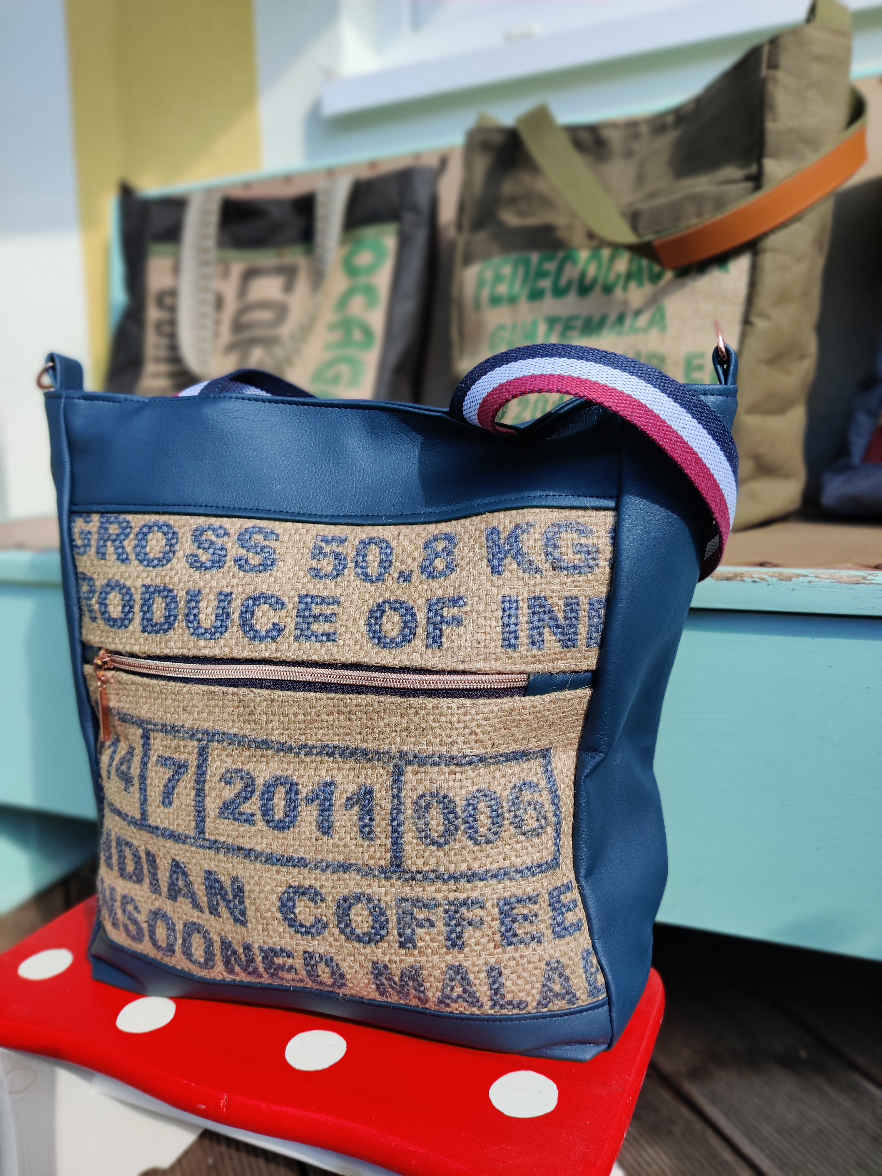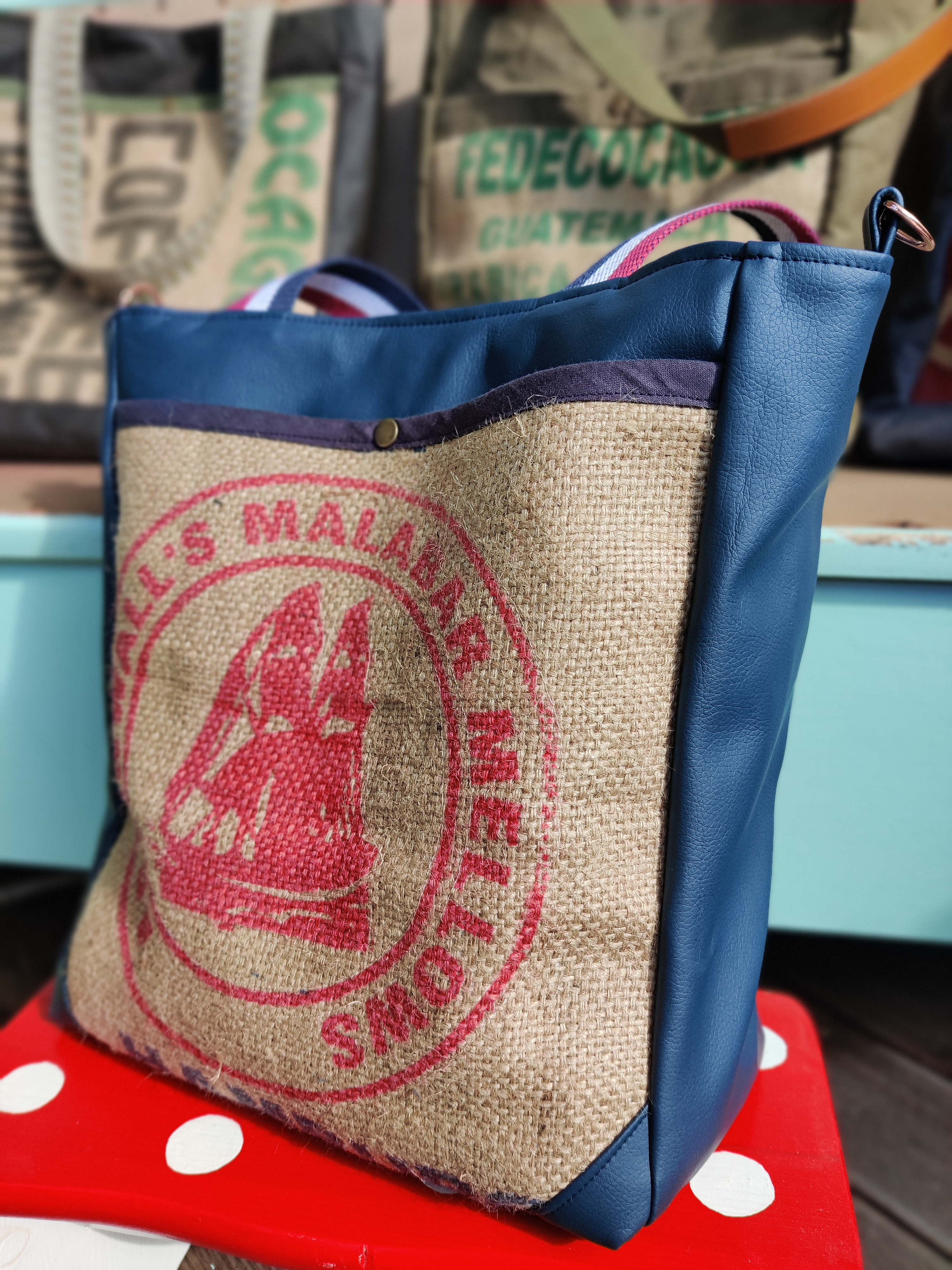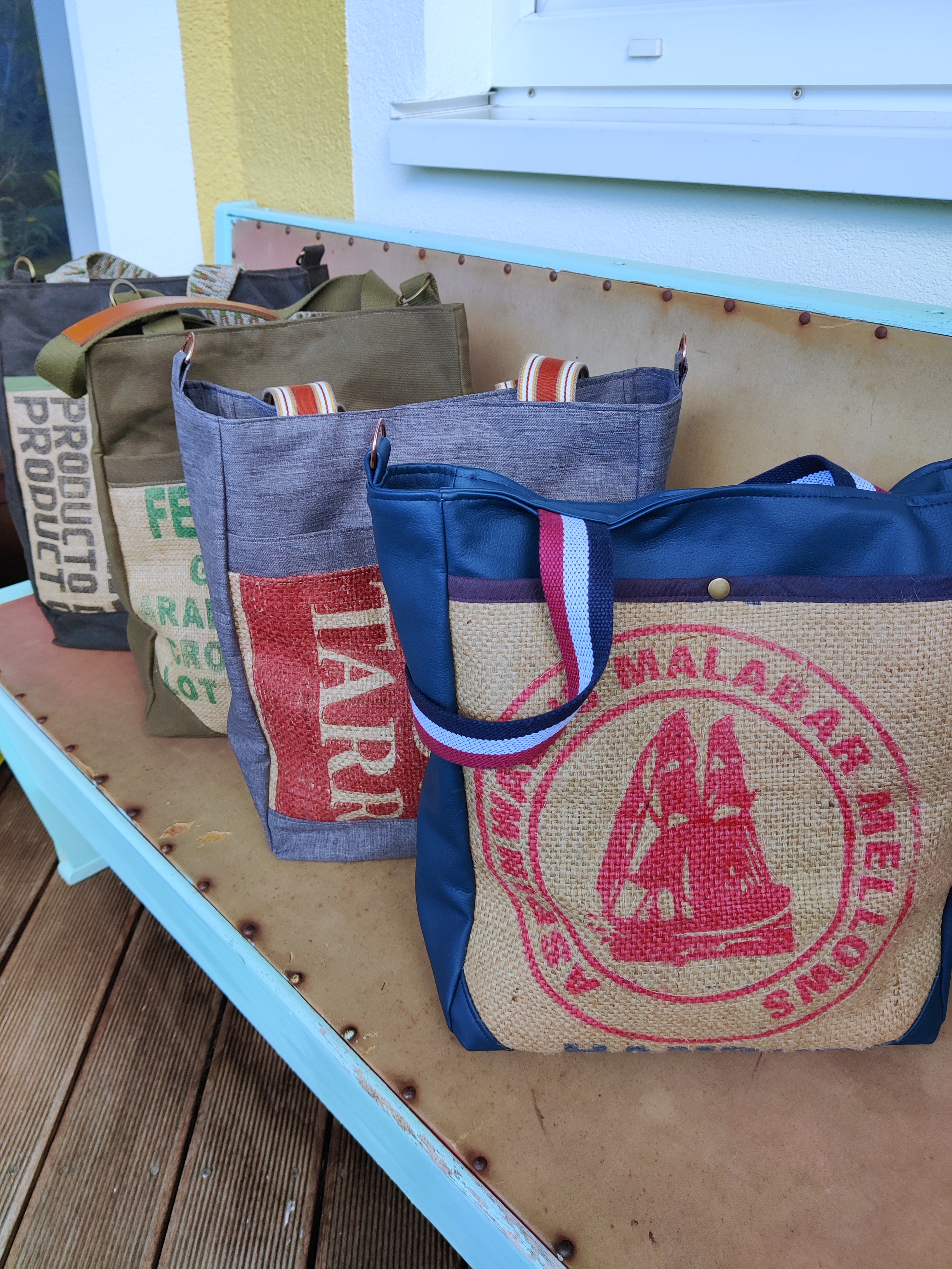 Warum Kaffeesäcke wegwerfen wenn daraus solche Schönheit entstehen können? Das Ergebnis ist alles Gefussel und Maschinenputzen wert!! Jede Tasche ist motivbedingt ein bisschen anders. Jede hat aber aussen und innen praktische Steck- und Zipperfächer, ein Schlüsselband, einen Magnetverschluss und einen zusätzlichen abnehmbaren Tragegurt. Diese beiden Schätzchen hier sind mit Kunstleder und Outdoorstoff kombiniert und haben die Maße 40 x 38 x 13 cm.