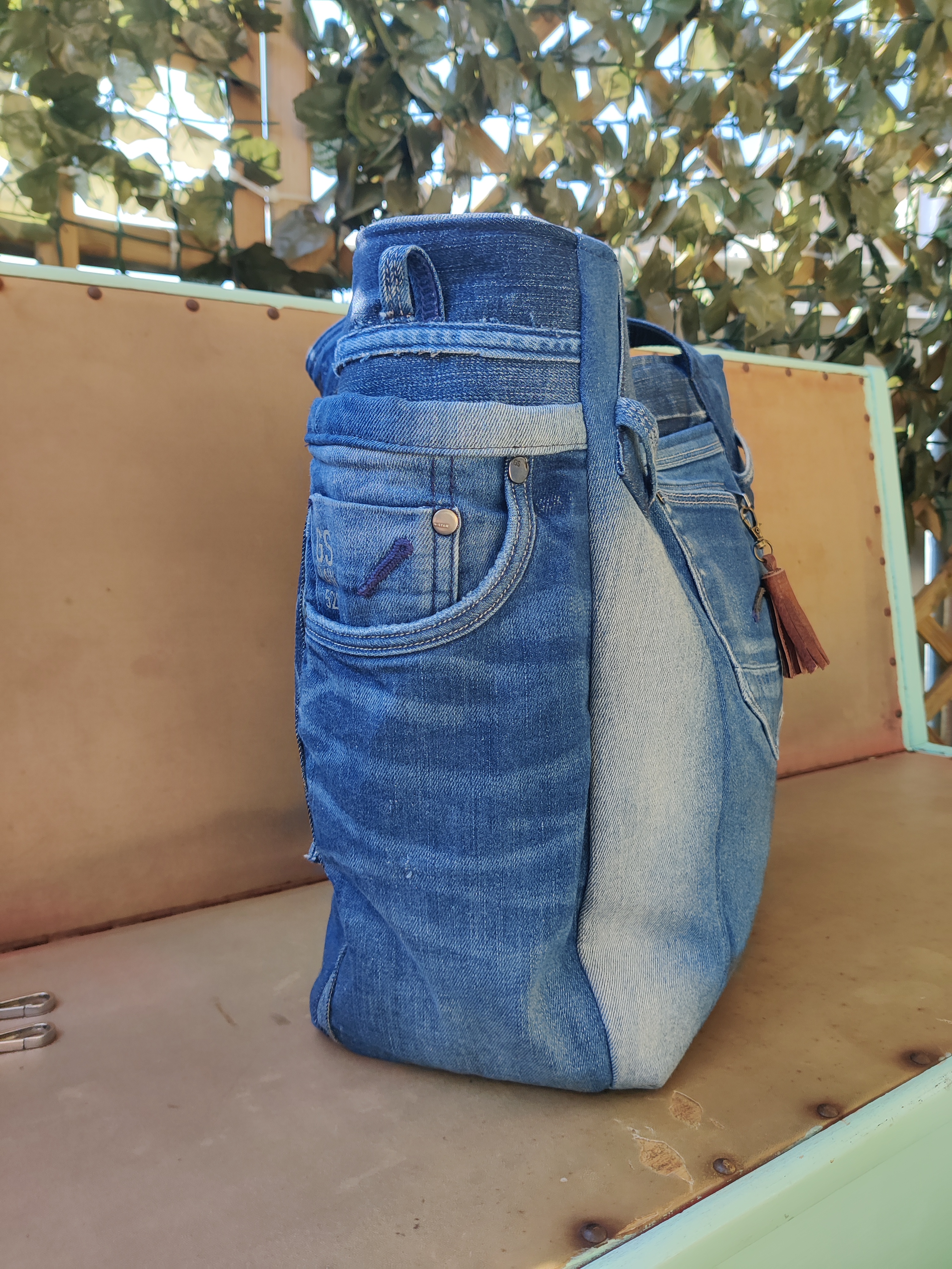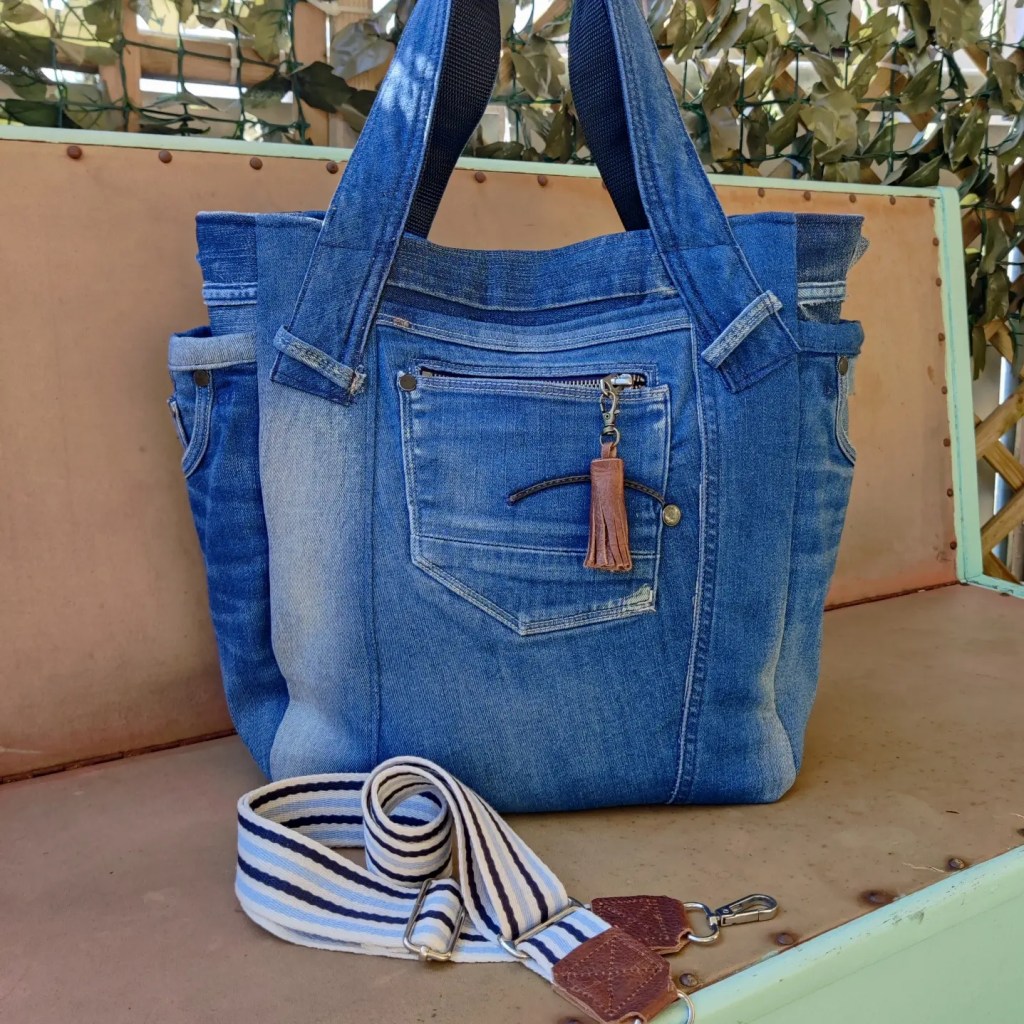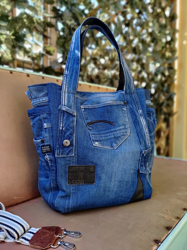 Auch dieses Schätzchen ist noch rechtzeitig für den Ostermarkt kommenden Sonntag fertig geworden! Für die Lederdetails hab ich ein Paar Stiefel zerlegt, denn auch hier gilt: Nichts verschwenden, wiederverwenden! Der Shopper aus einer coolen G-Star Jeans im used Look hat die Maße 45 x 35 x 15 cm, ist mit Magnet Druckknopf zu schließen, hat einen robusten, wasserabweisenden Boden, ein zusätzliches abnehmbares Gurtband, innen und außen praktische Fächer, ein Schlüsselband und einen chicen Lederbommel – summa summarum eine einzigartige Tasche für alle Anforderungen des Alltags.