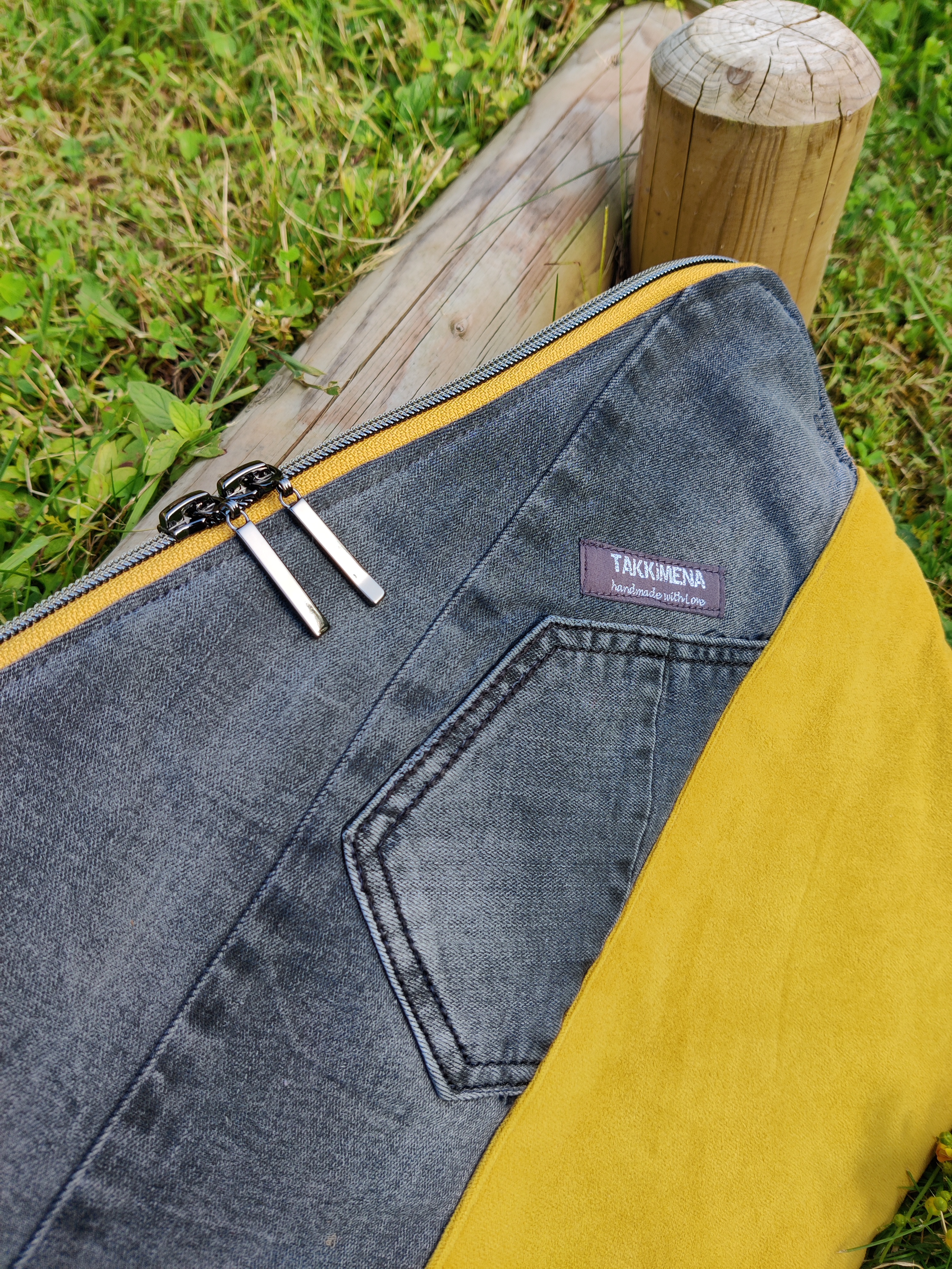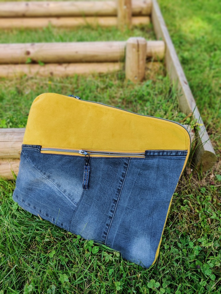 Schlichte Laptophülle aus grauer Jeans in Kombination mit curryfarbenem Möbelsvelour. Innen gepolstertes Fach und gemusterter Baumwollstoff. Alles genau nach Kundenwunsch und auf Laptopgröße genäht, mit etwas Luft damit auch noch ein Collegeblock hineinpasst. Der Schnitt, in angepasster Form, ist von hansedelli die kuoria. Happy Customer – Happy me 💙