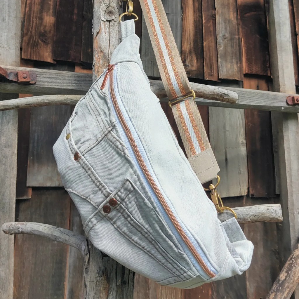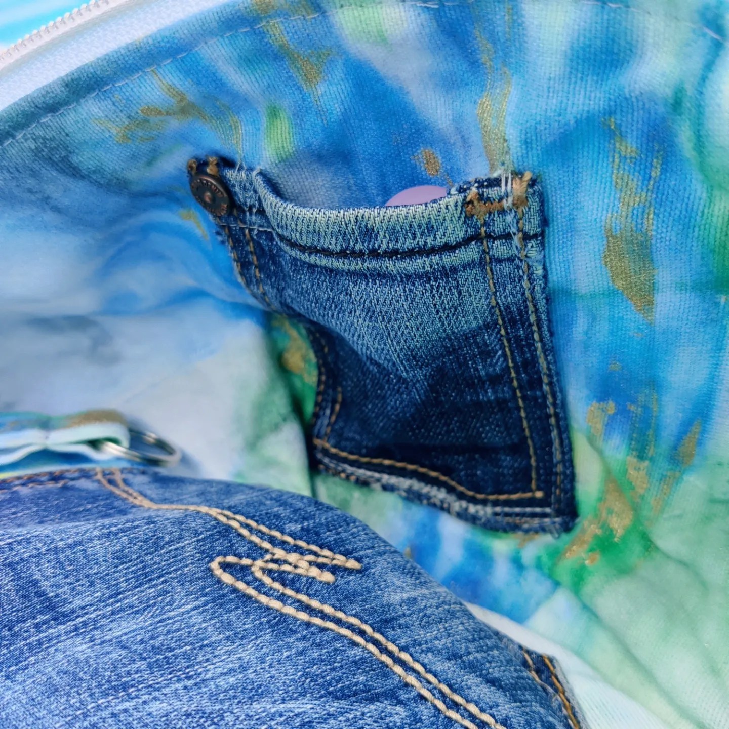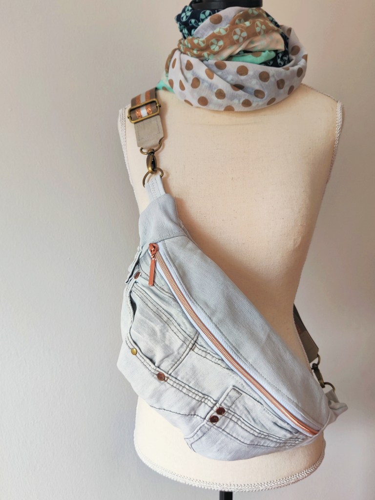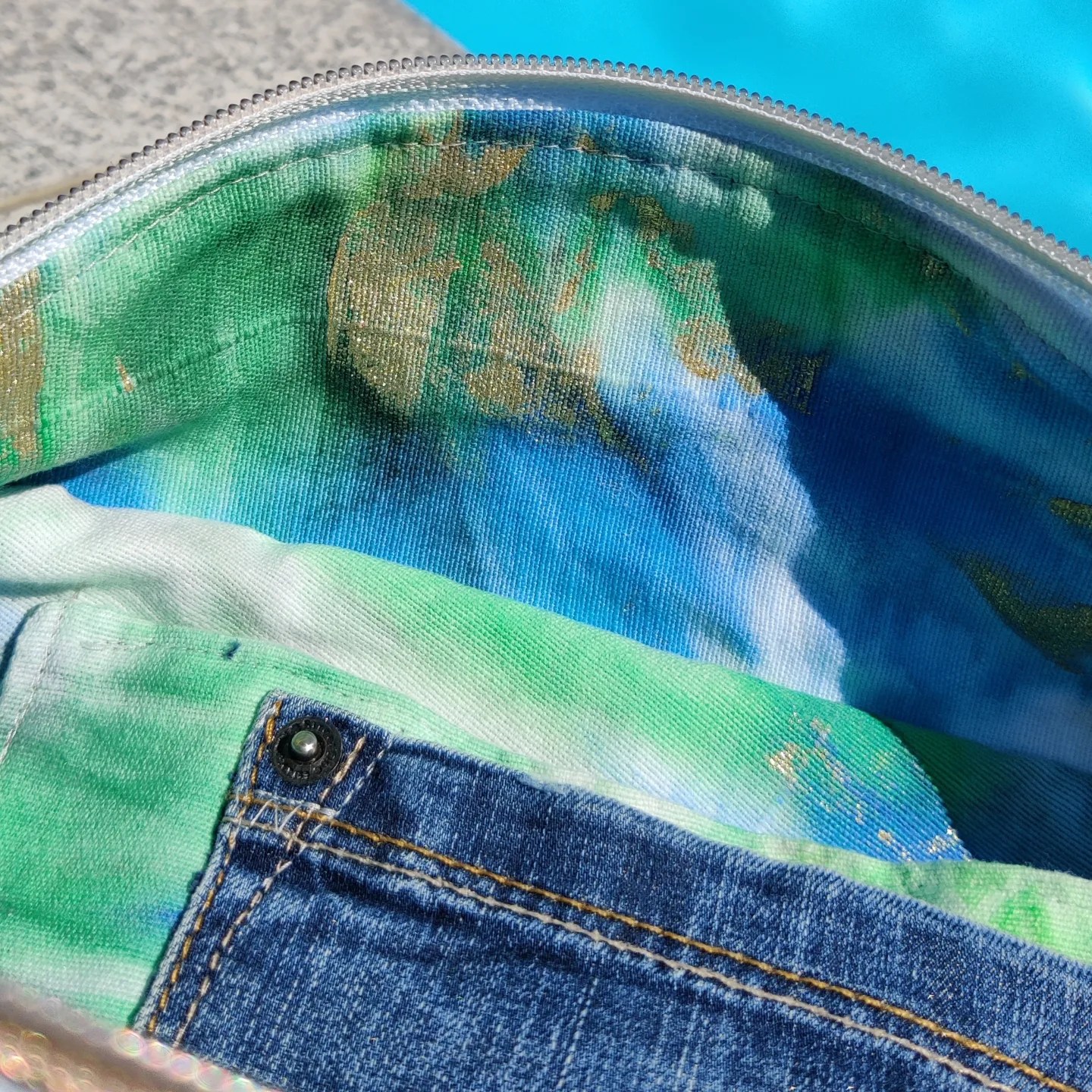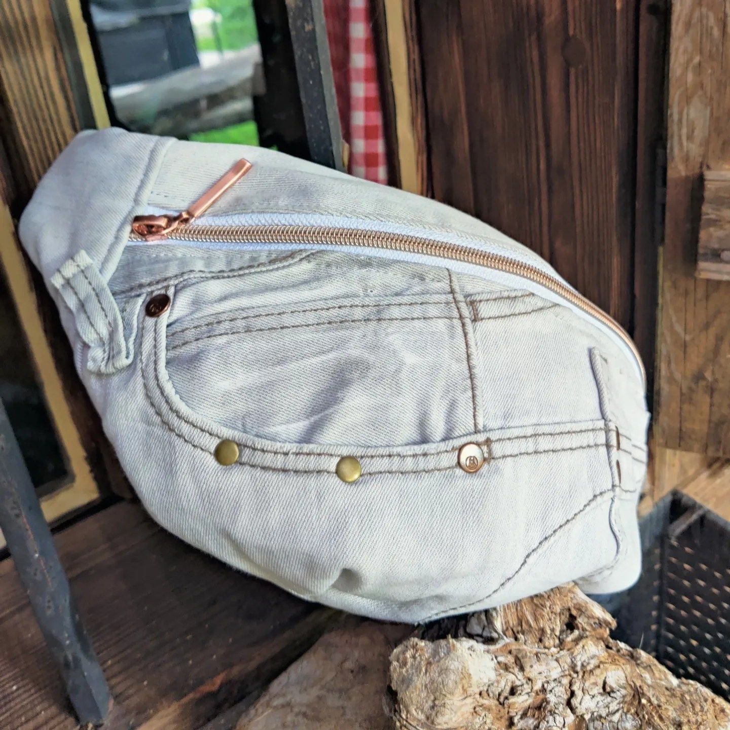 Das Tutorial (siehe Beitrag hier) kenn ihr ja schon – hier ist sie nun in ihrer ganzen Pracht: meine herrliche kleine praktische Tasche. Das wichtigste stets nah dabei und Hände frei. Das Gurtband von Giraffenland finde ich mega schön, passt so richtig zum Sommer, oder? Der Futterstoff ist selbst gebatikt mit einem Hauch gold 🤩 Batiken ist gerade im Sommer eine prima Aktivitäten mit/für Kinder! Ich freu mich so sehr, meine Lieblingsjeans in dieser chicen Variante wieder tragen zu können 👏
