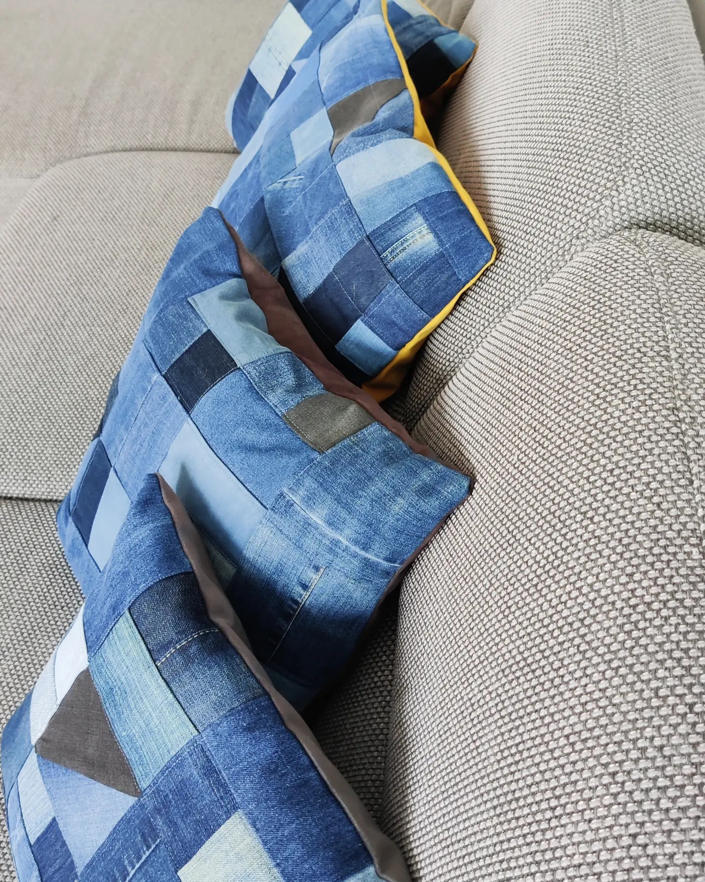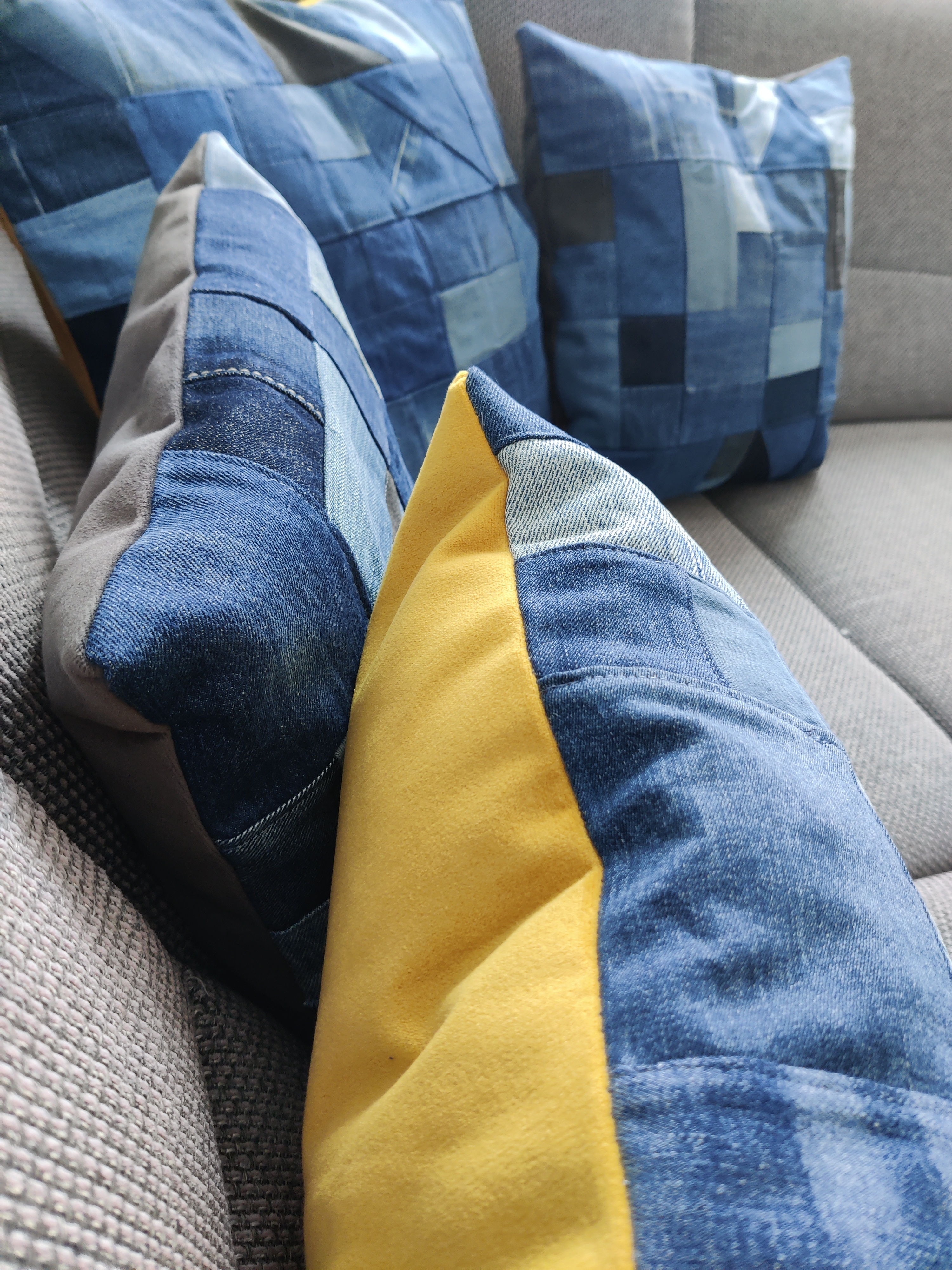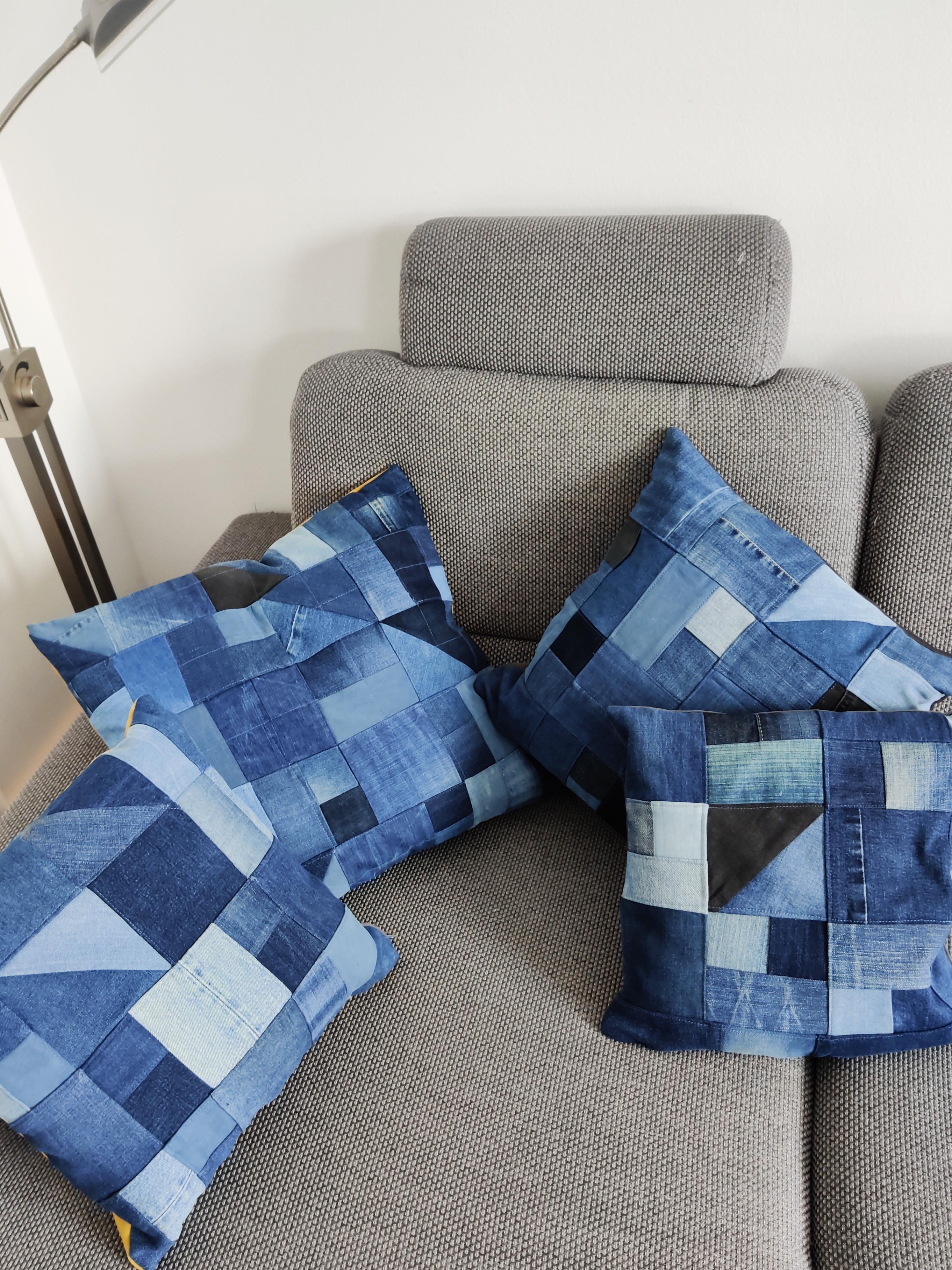 Und jetzt ran an die Couch 👉Aktion ‚Schöner wohnen‘ Teil 2! Diese Kissen waren aufgrund der kleineren Teile etwas aufwendiger zu nähen, aber es hat Spaß gemacht. Ich finde, es sieht mega aus !! Natürlich haben alle Kissen einen praktischen Reißverschluss. Die Rückseiten sind aus kuschelige Samtstoff. Jedesmal, wenn ich jetzt auf dem Sofa relaxe, seh ich Teile meiner Lieblingsjeans, das ist cool 👍👖♻️ und hurra, auch hier habe ich das OK der Family bekommen 😉