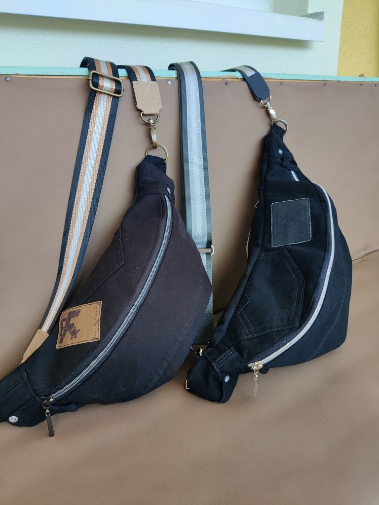Eine große und eine kleinere Crossbody Bag, wunschgemäß dezent aus einer schwarzen Jeans genäht und damit perfekt zum Ausgehen oder edlere Anlässe 🥳 Beide Schätzchen haben innen extra Kartenfächer und ein Fach für z.b. Lippenstift. Es war mir wie immer eine Ehre, Ladies 🤩😘 Viel Spaß damit!