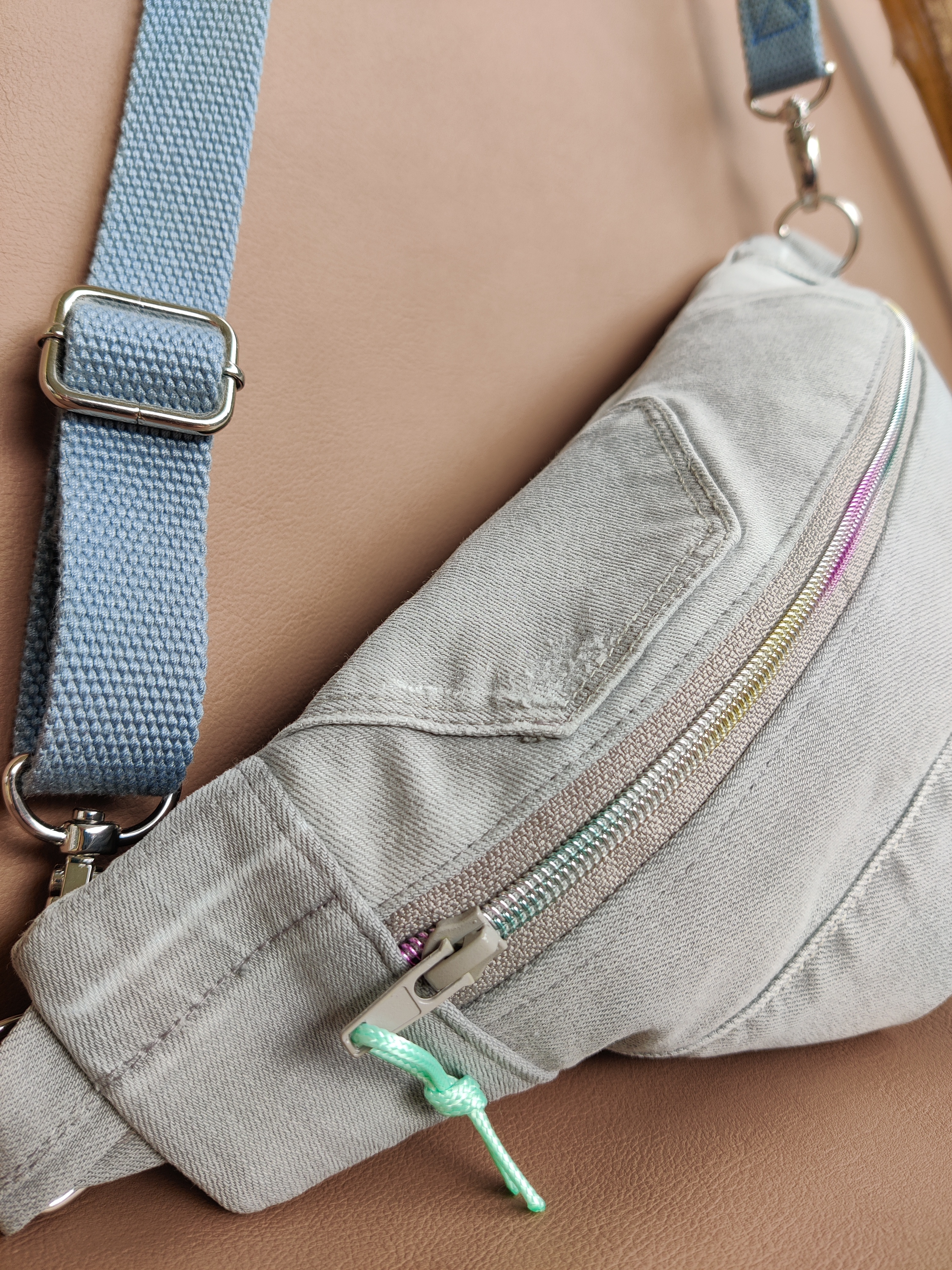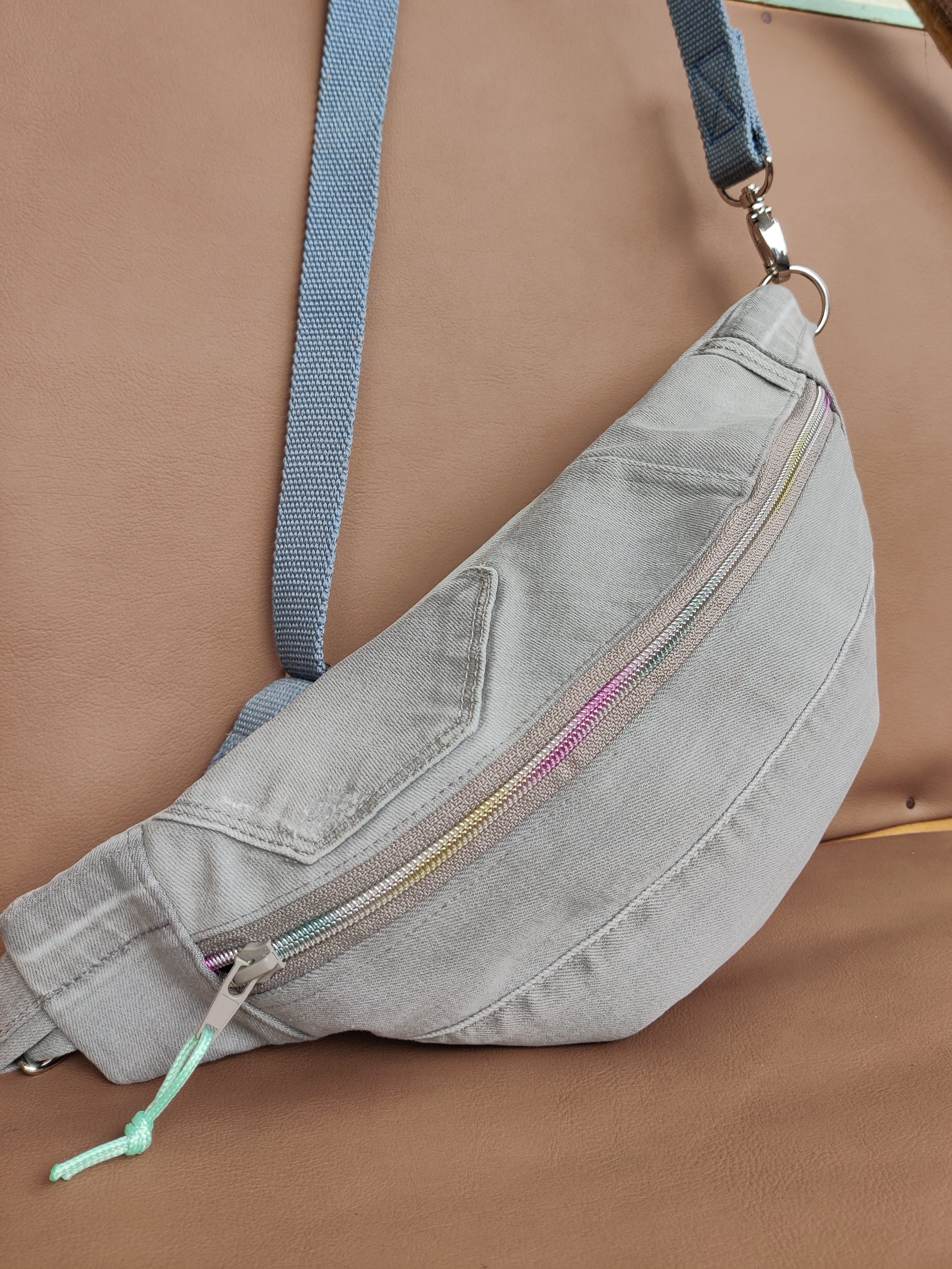 Absolut einzigartig, genau nach den persönlichen Vorstellungen und – wie bei der hellgrauen Tasche – auch voller Erinnerungen: Hier durfte ich aus einer zu klein gewordenen Jeans der Tochter eine Crossbody Bag für die Mama nähen! Jetzt kann die Hose noch lange getragen werden, von beiden 😉