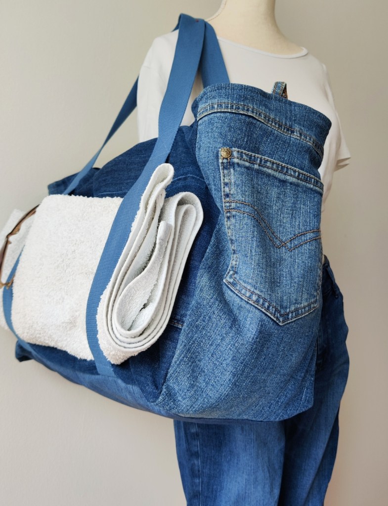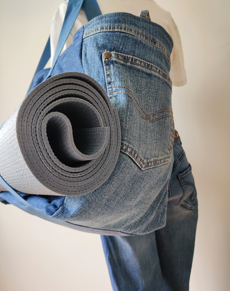 Was braucht ein(e) Yogi neben Matte und Kissen? Na klar, eine Tasche in die alles reinpasst! Dieses Schätzchen aus zwei großen Jeans habe ich extra für die yoga.tage nächste Woche entworfen. An den seitlichen Gurten lässt sich die Yogamatte fixieren, damit im Innenraum mehr Platz ist für alle anderen wichtigen Dinge. Innen gibt es seitlich zwei große Fächer, ein Schlüsselband und ein kleines Zipperfach. Das Schöne an der Tasche ist, dass sie 1. zu jedem Outfit und jeder Yoga-Matten-Farbe passt (Jeans geht immer, oder ?) und 2. auch prima für andere Zwecke zu verwenden ist, z.B. als Weekender oder als Badetasche. Multi funktional also. Maße: L 45cm x B 21cm x H 34cm. … Wie gefällt sie euch? Soll ich noch mehr davon nähen?