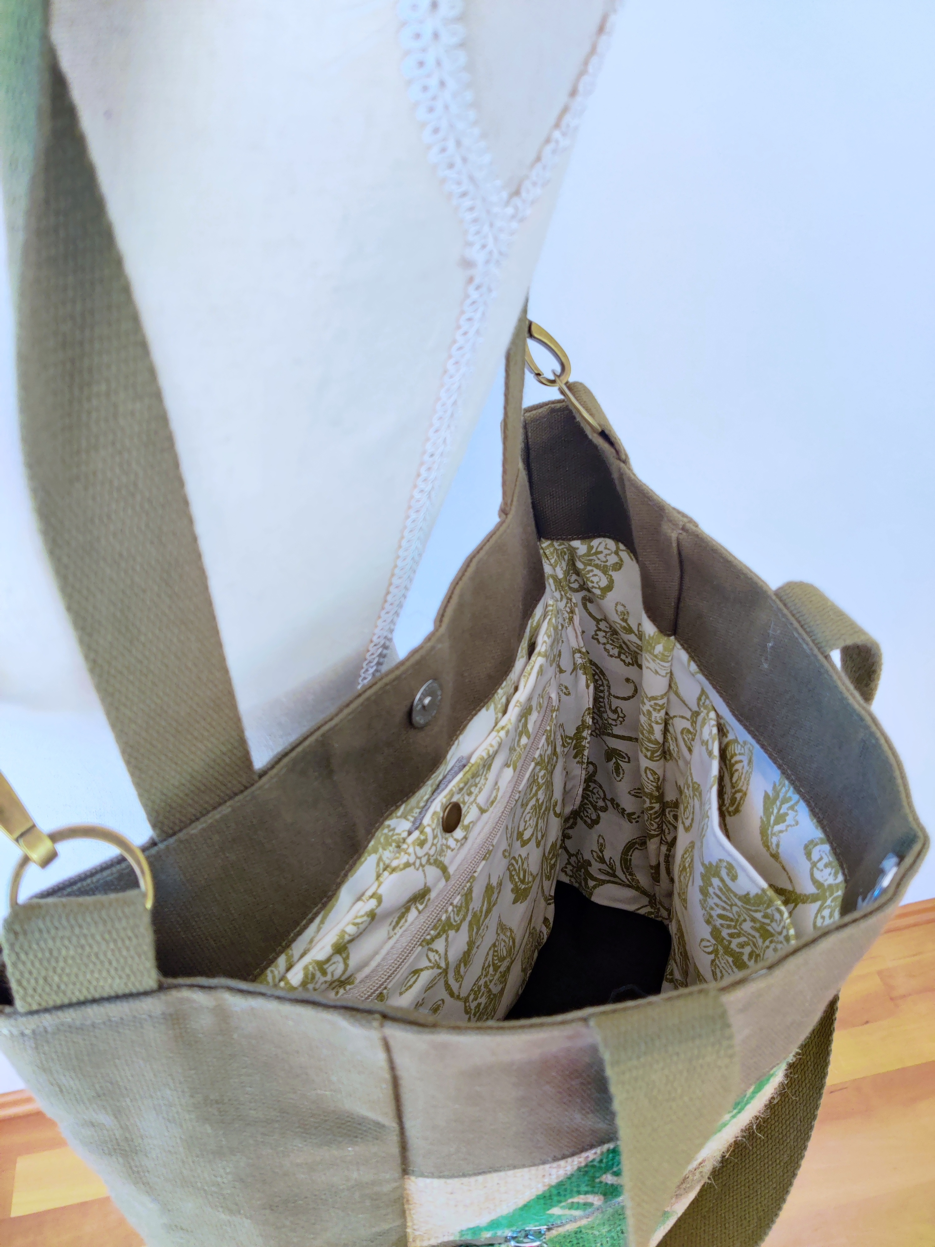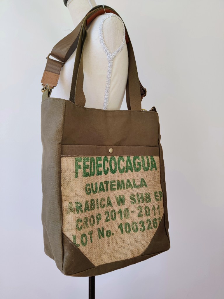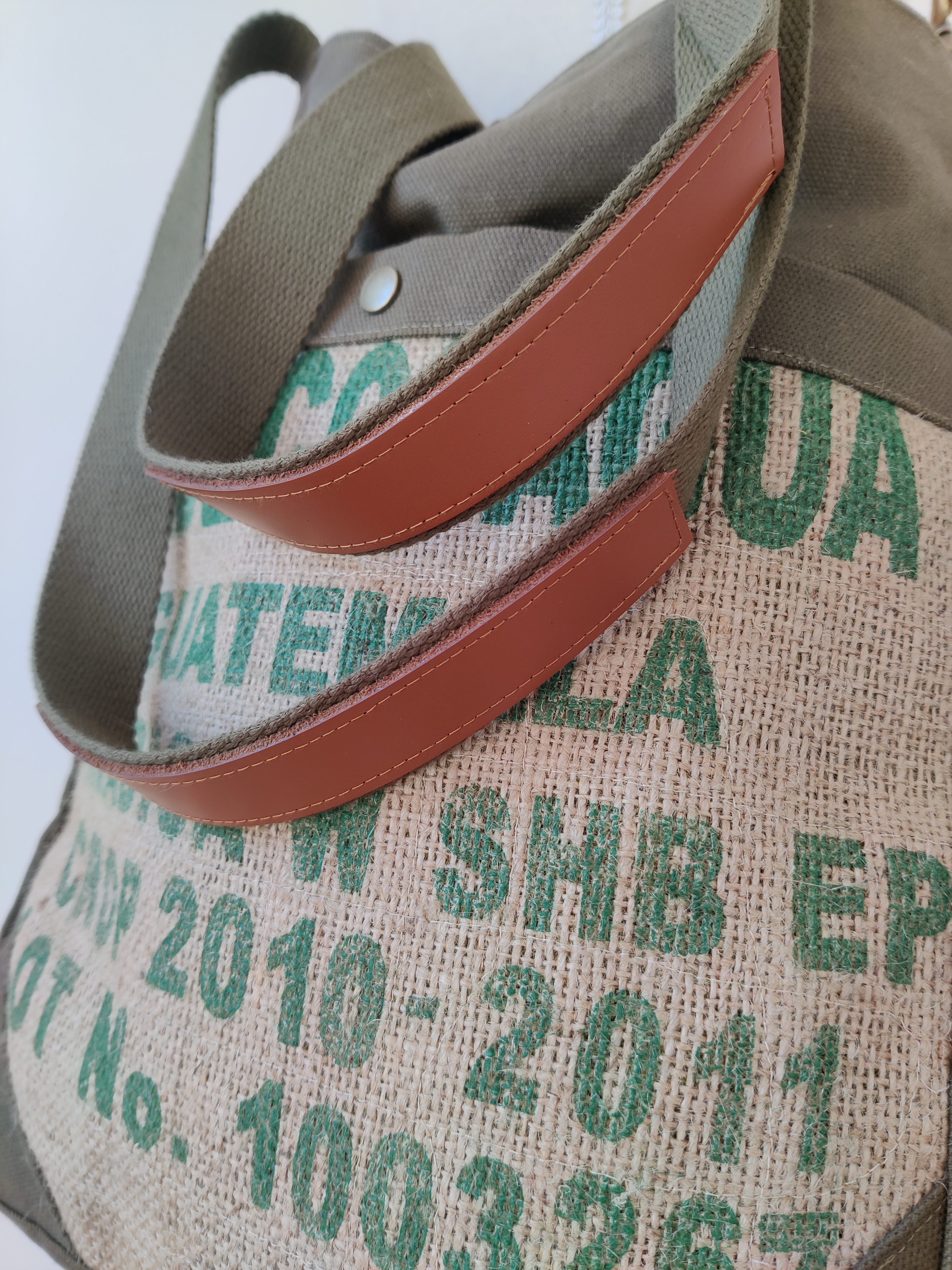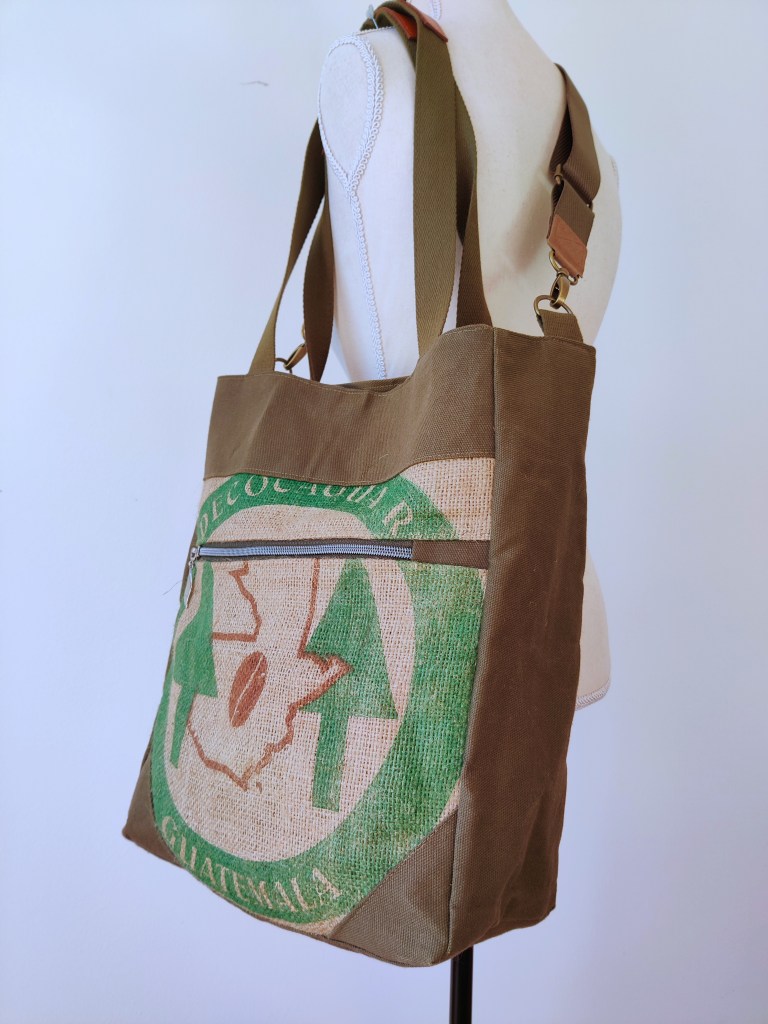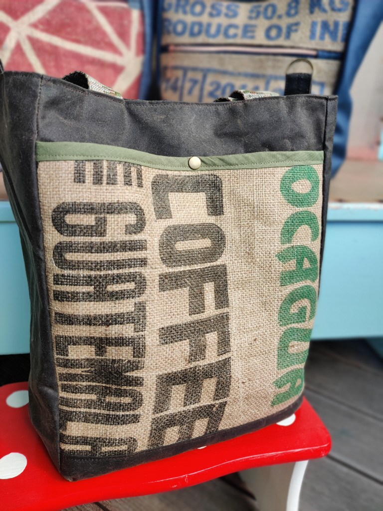 Warum Kaffeesäcke wegwerfen wenn daraus solche Schönheit entstehen können? Das Ergebnis ist alles Gefussel und Maschinenputzen wert!! Jede Tasche ist motivbedingt ein bisschen anders. Jede hat aber aussen und innen praktische Steck- und Zipperfächer, ein Schlüsselband, einen Magnetverschluss und einen zusätzlichen abnehmbaren Tragegurt. Diese beiden Schätzchen hier sind mit Kunstleder und Outdoorstoff kombiniert und haben die Maße 40 x 38 x 13 cm.