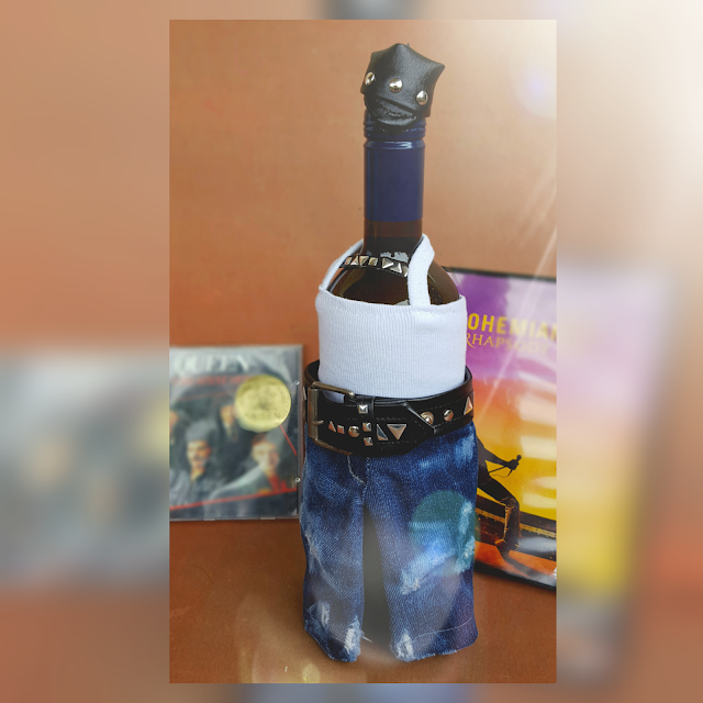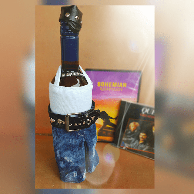 Der grosse Freddie war ein Geburtstagsgeschenk für meine Lieblingsschwägerin! Ich fand es richtig genial, dass sie sich ausdrücklich einen Freddie gewünscht hat! Er sollte aber bitte Weinflaschengröße haben. Feinripp, Jeans und Gürtelschnalle stammen aus meiner Altkleiderkiste, nur Kunstleder und Nieten sind neu (Tipp: aufbügelbare Nieten). Richtige Nieten (einschlagen) sehen aber cooler aus. Als Zugabe bekam dieser Freddie sogar eine Mütze. Flaschenwechseln ist auch kein Problem da seine Jeans hinten einen Druckknopf hat.