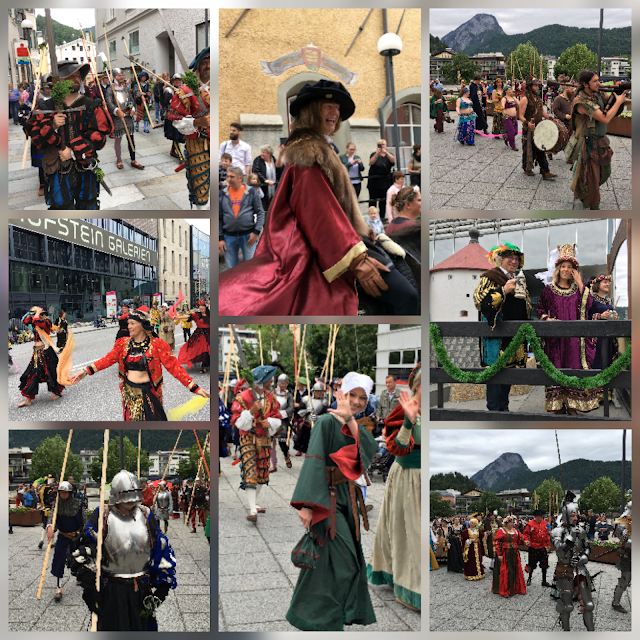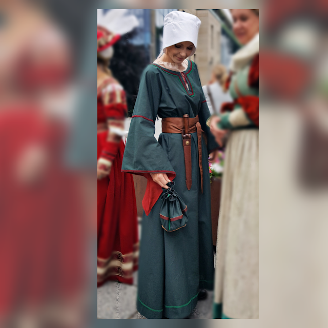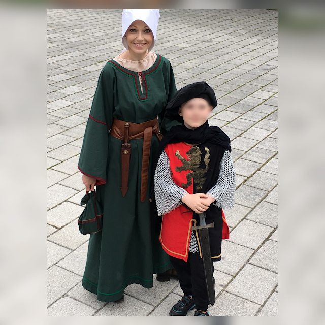 Geschafft! DIESES Jahr sind wir pünktlich zum Ritterfest ordentlich gewandet! Der tapfere Ritter hat seinen Waffenrock vom letzten Jahr mit edlem Ziehrrat wie Kettenhemd und Barett verschönert. Und weil ich ihn unbedingt beim großartigen Spektakulum, dem traditionellen Ritterumzug, begleiten wollte (und weil ich Kostüme/Verkleiden liebe *grins*) hab ich mir auch etwas passendes gezaubert. Denn nur wer gewandet ist darf überhaupt beim Umzug mitgehen! Außerdem war dieses Jahr unser allseits geliebter Kaiser Maximilian I. persönlich mit prächtigem Gefolge anwesend und gewährte den Bürgern huldvoll eine Audienz. Ehrenmedaillien verlieh er auch – da soll nochmal jemand sagen bei uns wäre nichts los! Meine Gewandung ist mit Ausnahme des Ledergürtels komplett selbst genäht. Mein kleiner Dolch und das Schwert des edlen Ritters sind Leihgaben vom Heimatverein Kufstein. Grüner schlichter Baumwollstoff, Dekobänder, weiße Haube (jede Frau trug anno dazumals eine Kopfbedeckung, hab ich gelernt), dünne beige Bluse für drunter und natürlich ein kleiner mit Leder verzierter Beutel. Ohne Handtasche kann ich auch als mittelalterliche Maid nicht außer Haus 😉 Der rote Stoff an den Ärmeln war mal ein Vorhang. Schnitt für Kleid, Bluse und Beutel hab ich selbst gemacht, die Anleitung für die Haube hab ich hier gefunden Das Nähen und Tüfteln hat riesen Spaß gemacht, bin sehr zufrieden mit dem Ergebnis. Wir hatten einen lustigen und aufregenden Tag bei Kaiserwetter und freuen uns auf nächstes Jahr!