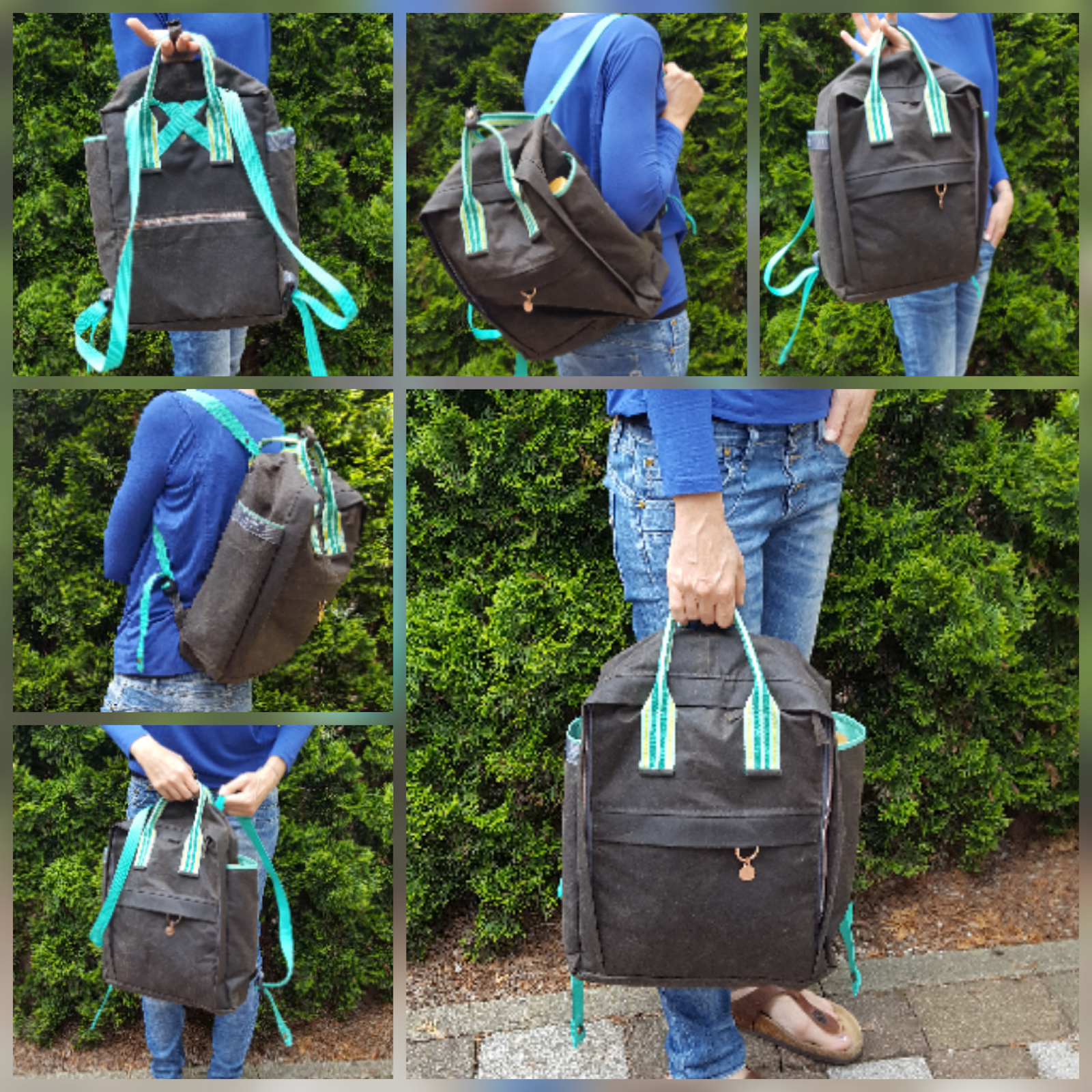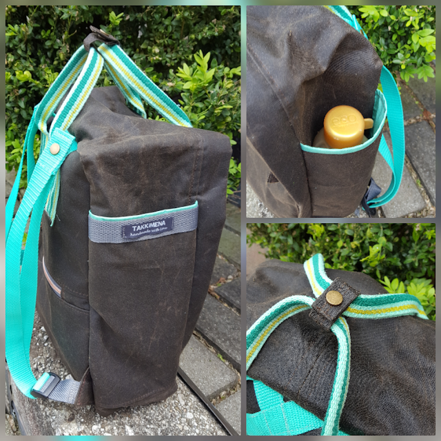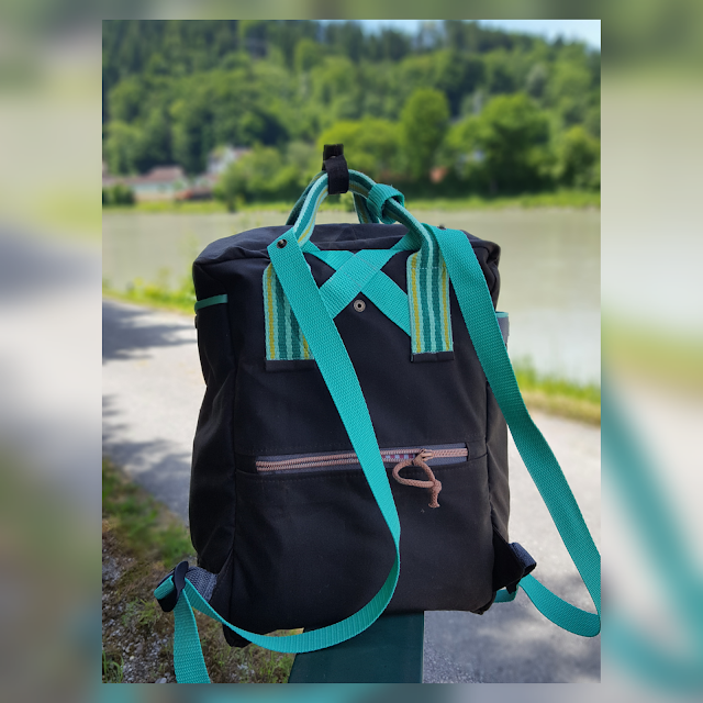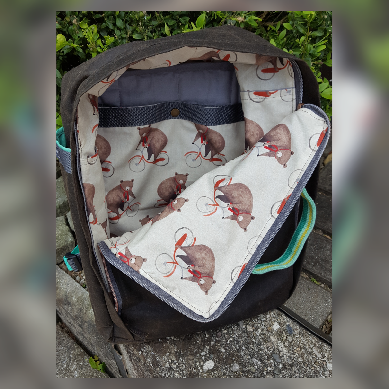 Da ist er, meine Nummer zwei! Reich an Erfahrungen aus dem ersten Versuch (siehe Blogbeitrag hier) näht es sich gleich viel leichter. An zwei Abenden hatte ich ihn fertig, meinen neuen Rucksack nach dem freebock von meinanderesich. Sich endlich für eine Farb/Material/Gurtbandkombi zu entscheiden hat am längsten gedauert. Die Wahl fiel schließlich auf meine Lieblingsfarbe mint (Überraschung, haha), den dunkelbraunen Heavy Oilskin für außen und den entzückenden Bärenstoff für innen. In die fahrradfahrenden Bären war ich sofort verliebt. Bis auf das gestreifte Gurtband (Reste einer alten Tasche) und den Schieberanhänger sind alle Materialien von snaply. Den ursprünglichen Schnitt hab ich etwas abgewandelt: Vorne ist mir ein Zipperfach mit Blende lieber als die aufgesetzte Tasche. Die seitlichen Fächer hab ich etwas erhöht, passt besser für meine Flasche(n). Am Rücken ist mir das Zipperfach fürs Handy besonders wichtig, das muss ich immer schnell griffbereit haben. Innen sind ein Schlüsselband und ein paar Extrafächer eingebaut (Zipperfach im Deckel, Seitenfächer, A4-Fach am Rücken). Ich mag kein wildes Herumgekugle sondern alles ordentlich an seinem Platz. Genau DAS liebe ich so am Nähen, ich kann alles so anpassen wie ich es mag.Mein neuer Rucksackfreund ist inzwischen mein täglicher Begleiter. Auch schwere Einkäufe meistert er bravourös. Ich freue mich schon auf den Urlaub mit ihm! Hach, und wie perfekt er ins/zum Fahrrad passt 🙂