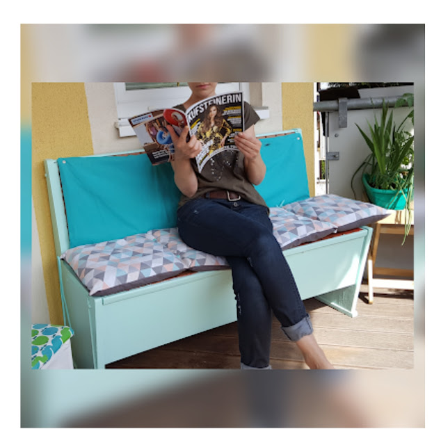 Nochmal die Schulbank drücken? Na, da ist es mir doch wesentlich lieber die Schulbank zu bearbeiten: schleifen, streichen, renovieren, benähen… also komplett aufmotzen, und alles in meinen Lieblingsfarben! Das grobmotorische Handwerken hat richtig Spaß gemacht. Zuerst mussten die alten porösen Blenden runter. An manchen Stellen war die Bank danach so lädiert, dass ich MDF-Platten zuschneiden/montieren musste. Nachdem alles schön glatt geschliffen war ging´s ans Pinseln (2x). Die Farbe hat mir ein freundliches Fachgeschäft zusammengemischt, heißt „Frühlingsbrise“ oder so. Passt perfekt, namentlich und optisch. Die vier Sitzkissen sind mit einem wunderschönen Dekostoff (snaply) überzogen und können entweder einzeln oder zusammengeknipst verwendet werden (Druckknöpfe). Im türkisen Rückenteil steckt als Füllung eine alte Fleecedecke drin. Bin mit meiner Bankverschönerung superglücklich und genieß den Frühling jetzt noch mehr ! Und herzlichen Dank an Ina, die mir die alte Schulbank geschenkt hat – du bist jederzeit herzlich eingeladen auf Kaffee und Probesitzen!