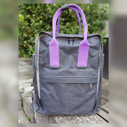 Dieses wunderschöne Exemplar ist aus grauem Fox Oilskin heavy mit Akzenten in lila (ihre Lieblingsfarbe). Hab daher auch extra eine lila Paspel und lila Etikett eingenäht. Lila (und in vielen anderen Farben) schimmern auch die Rainbow-Reissverschlüsse und Metallteile. Und für die grosse Katzenfreundin passt der Futterstoff natürlich perfekt. Eine der Katzen ziert als Applikation das dazugehörige Mini-Täschchen. Innen und aussen gibts – wie immer bei mir – diverse Fächer.